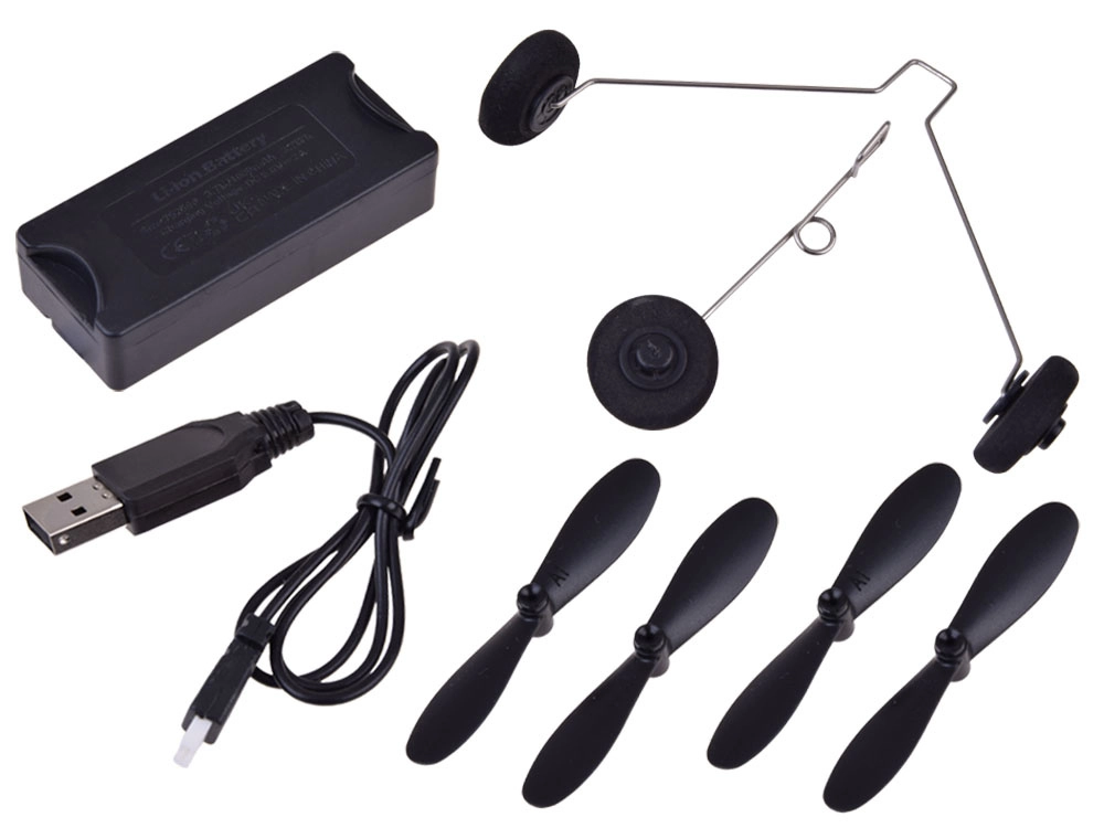 La boîte contient des hélices de rechange, le train d’atterrissage, un câble USB et une radiocommande 2,4 GHz. Il suffit d’assembler, de charger et de décoller.