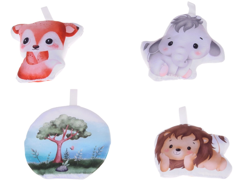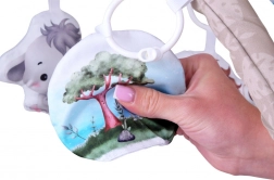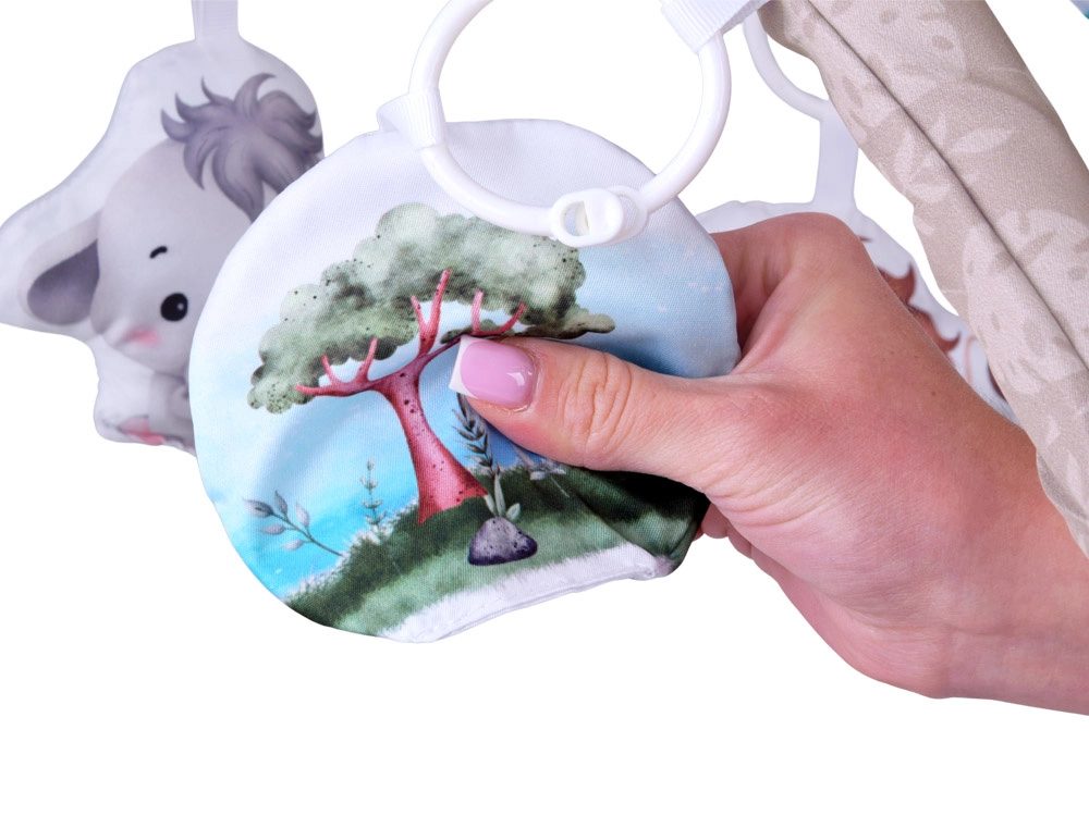 Un petit renard, un lionceau, un éléphanteau, un arbre bruissant et un miroir sécurisé peuvent être facilement déplacés ou détachés. L’enfant découvre ainsi différentes formes, textures et sons tout en entraînant sa motricité fine.