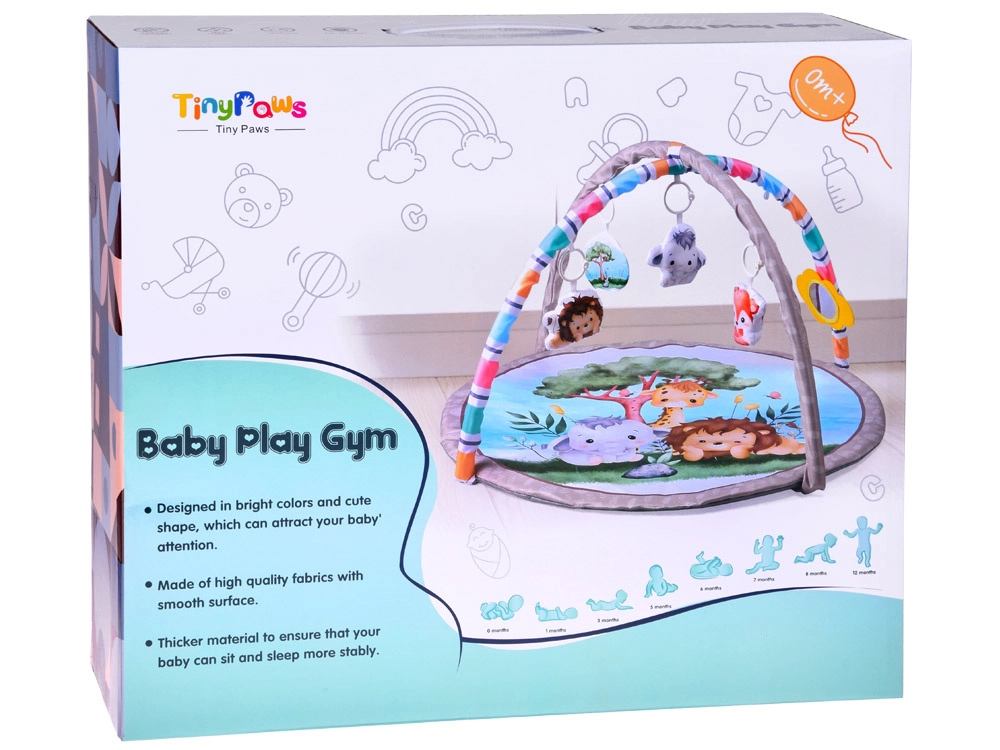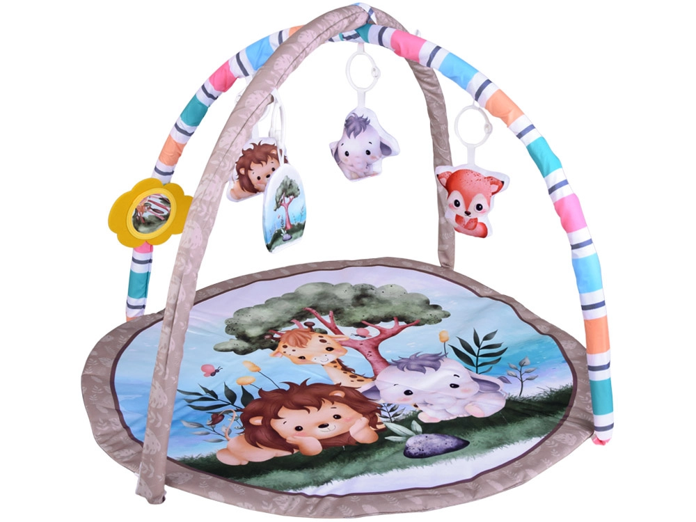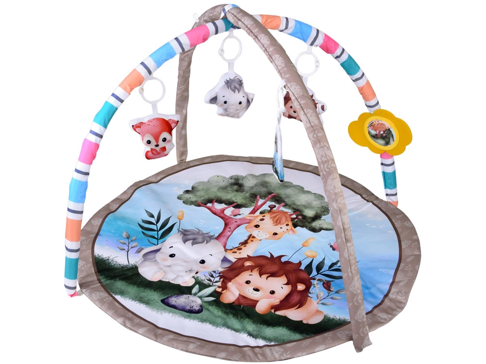 Ce tapis d’éveil rond aux motifs safari (lion, éléphant, girafe) offre un environnement doux et accueillant qui stimule la curiosité et l’exploration autonome. Deux arches croisées rembourrées avec des jouets suspendus et un miroir sécurisé incassable invitent bébé à s’étirer, attraper et donner des coups de pied, favorisant ainsi la motricité globale et fine.
