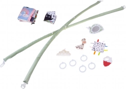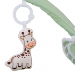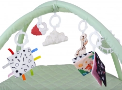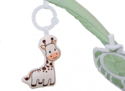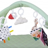 Deux arches flexibles se détachent facilement pour le lavage ou les déplacements. Les jouets suspendus – anneau de dentition, nuage, girafe et carrés bruissants – encouragent l’extension des bras et stimulent les sens.