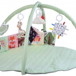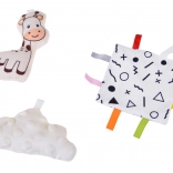 Il comprend un ensemble riche d’accessoires : girafe en peluche, petit nuage tout doux, anneau de dentition, miroir sécurisé, carré bruissant avec étiquettes et livres en tissu contrastés. Grâce à eux, le tapis « grandit » avec l’enfant – de l’observation au‑dessus de la tête, au jeu sur le ventre, jusqu’aux premiers retournements et à la position assise.