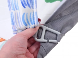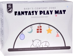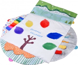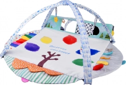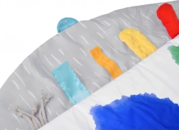 Il comprend un ensemble d’accessoires variés : miroir pour la découverte de soi, cartes contrastées pour le développement visuel, peluches à suspendre, anneaux de dentition, hochet et détails bruissants. Le tapis se plie rapidement, est léger à transporter et simple à entretenir – idéal à la maison et en voyage.