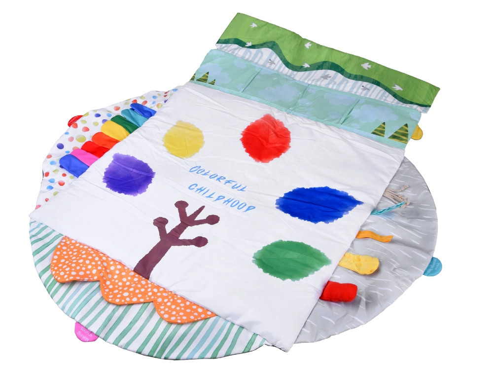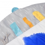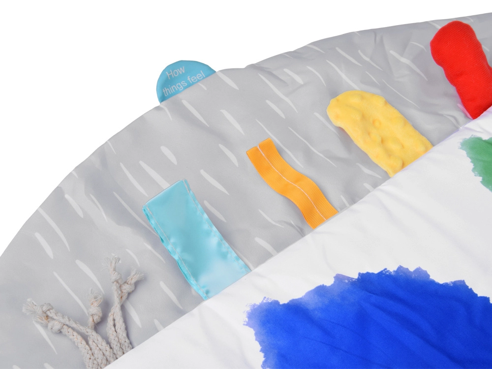 Il comprend un ensemble d’accessoires variés : miroir pour la découverte de soi, cartes contrastées pour le développement visuel, peluches à suspendre, anneaux de dentition, hochet et détails bruissants. Le tapis se plie rapidement, est léger à transporter et simple à entretenir – idéal à la maison et en voyage.
