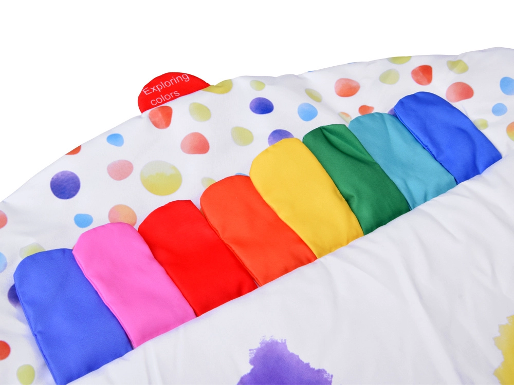 Ce grand tapis circulaire pour bébé offre une surface rembourrée confortable et un usage polyvalent : en nid d’éveil avec arches pour suspendre des jouets ou en tapis autonome pour le jeu libre et les exercices sur le ventre. Les motifs à fort contraste, les textures variées et les sons doux stimulent naturellement les sens et développent la motricité fine et globale.