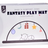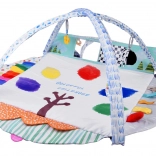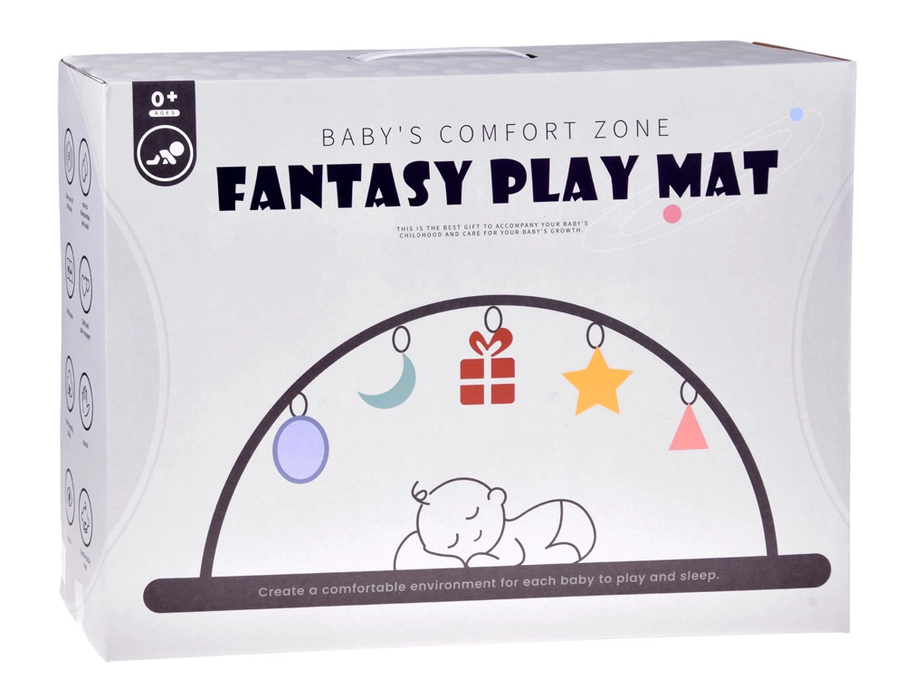 - Tapis, 2 arches, ensemble de jouets suspendus : miroir, cartes contrastées, anneaux de dentition (étoiles), balle contrastée molle, hochet, éléments bruissants