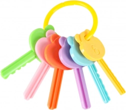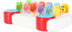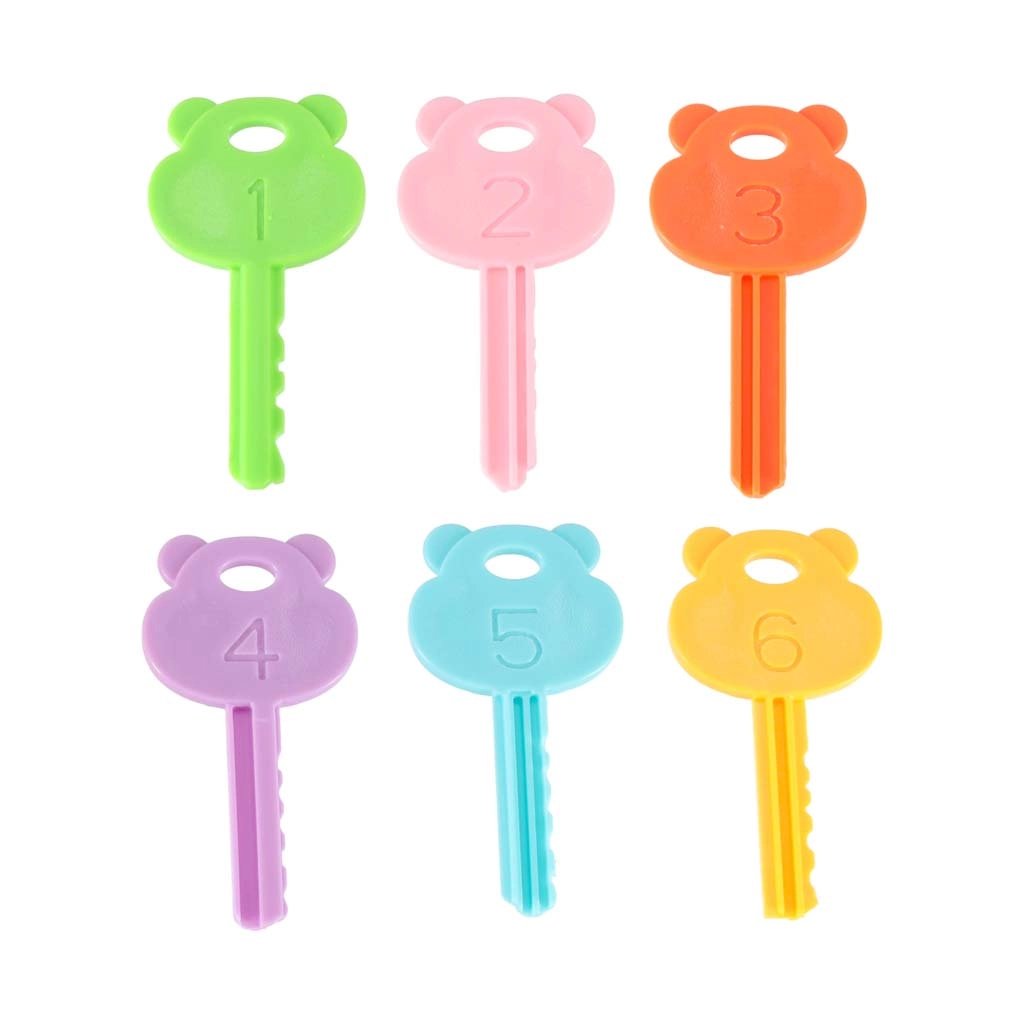 Six clés numérotées de couleurs différentes incitent les enfants à associer et distinguer. En tournant la clé, l’animal surgit et le chiffre retentit en anglais.