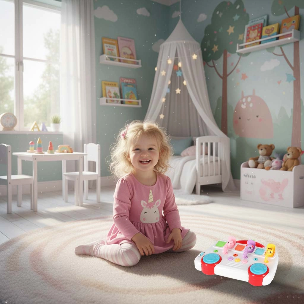 Les boutons bleus avec empreintes produisent des sons percussifs, tandis que les éléments rotatifs et interrupteurs favorisent la coordination et l’adresse des doigts.