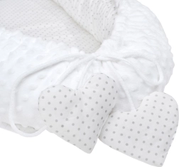 Le nid pour bébé New Baby Minky Cœur en blanc associe un tissu Minky extra doux et du coton 100 % pour un confort maximal. Grâce au réglage par cordon, vous ajustez facilement la taille et créez pour votre bébé un environnement douillet et sécurisé dans le lit, la poussette ou sur le canapé. Inclus : un petit oreiller en forme de cœur et une couette avec motif cœur.