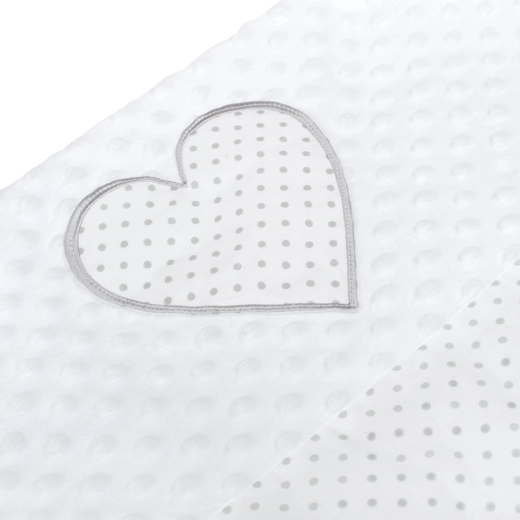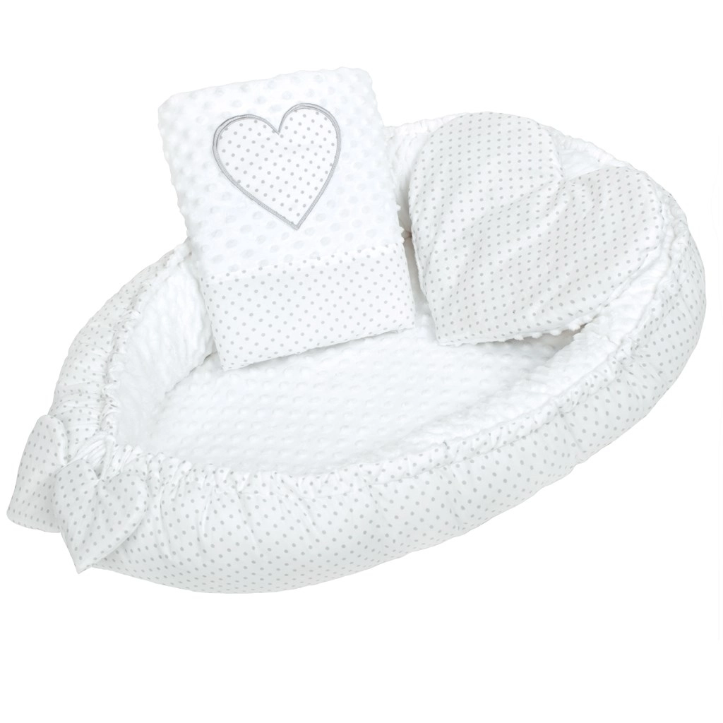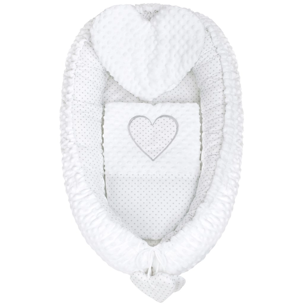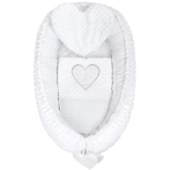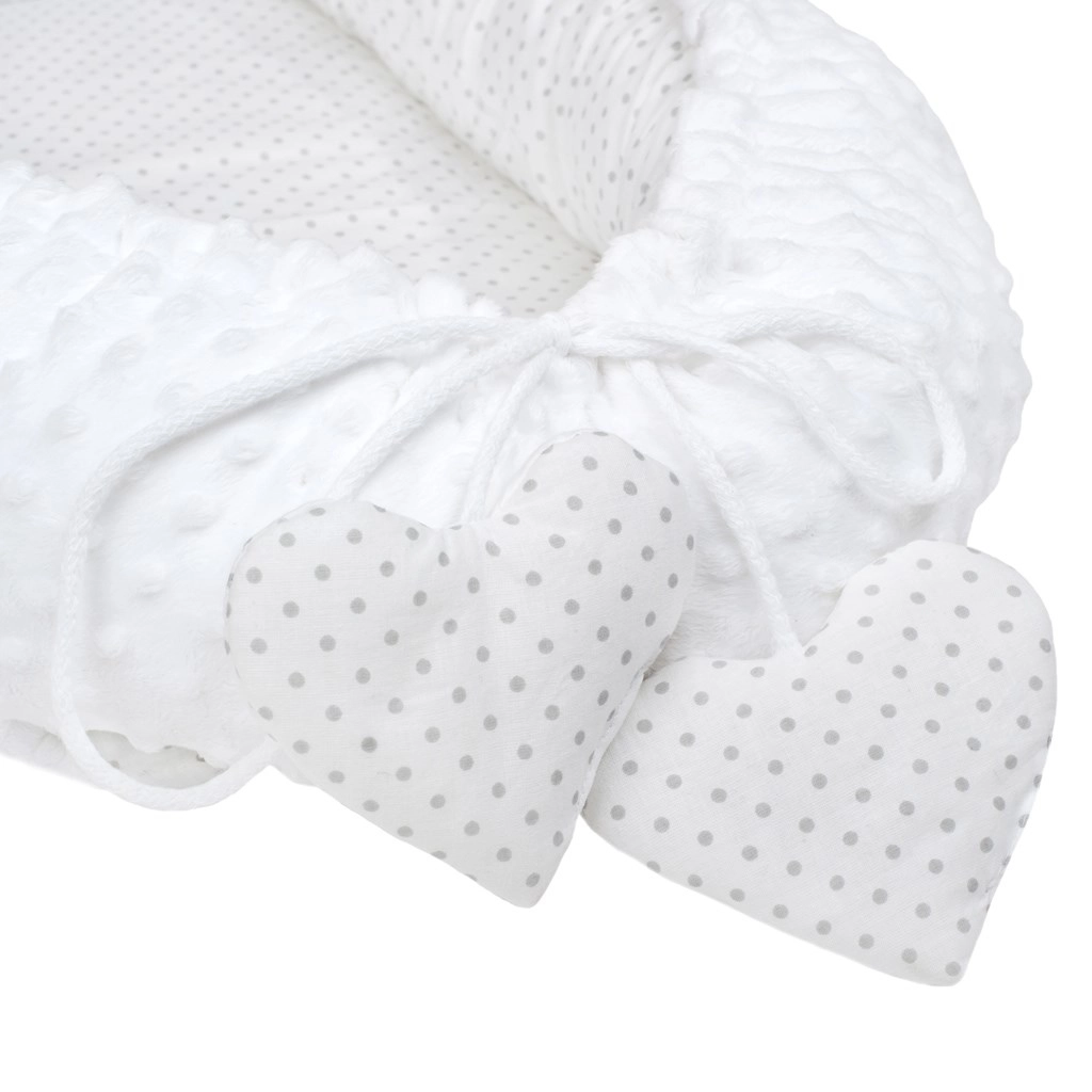 Le nid New Baby Minky Cœur a été conçu pour un sommeil paisible et un repos confortable des nouveau-nés. Sa conception réversible permet d’utiliser soit le côté Minky ultra doux à pois en relief pour une stimulation sensori-motrice délicate, soit le côté coton pour une respirabilité naturelle et un contact respectueux des peaux sensibles.
