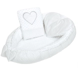Grâce au cordon de serrage pratique, vous ajustez facilement l’espace intérieur – d’une étreinte plus ferme à un couchage plus libre. Le nid est parfait dans le lit, la poussette, sur le canapé ou au sol, où il offre à l’enfant un cocon doux et sécurisé. Le set est complété par un oreiller en forme de cœur et une couette pour encore plus de confort.