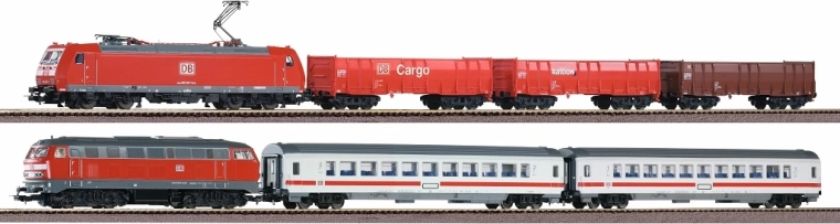 Le coffret contient une locomotive diesel BR 218 avec deux voitures voyageurs IC et une locomotive électrique BR 185 avec trois wagons tombereaux hauts – une combinaison idéale pour le trafic voyageurs et fret.