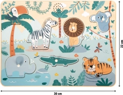 Le puzzle en bois à encastrer avec effets sonores transforme les premiers apprentissages en aventure. Les enfants placent le lion, le tigre, l'éléphant, le zèbre, le koala, le toucans et le crocodile aux bons endroits et, en soulevant la pièce, entendent le son authentique de l’animal. La fabrication de qualité en bois certifié FSC® est agréable au toucher et respectueuse de la nature.