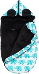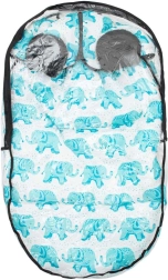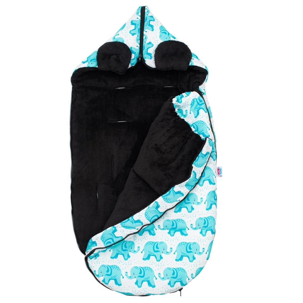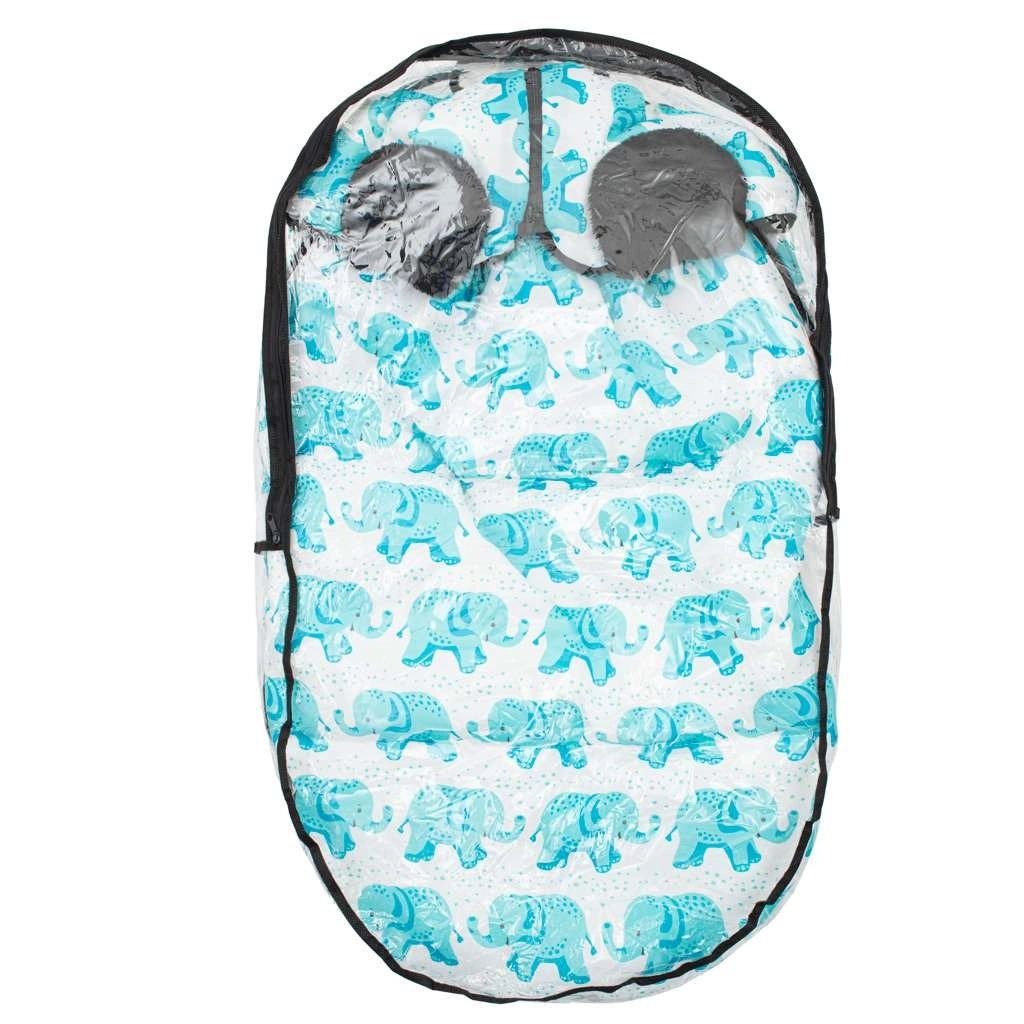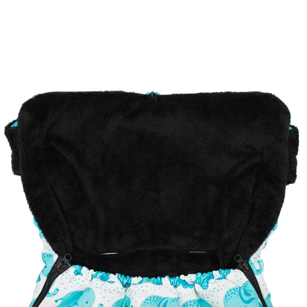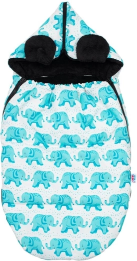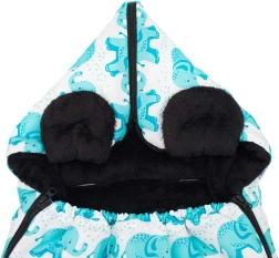 La sécurité est assurée par les ouvertures pour harnais de sécurité 5 points, qui maintiennent fermement le bébé attaché pendant le trajet. La partie supérieure resserrée forme une capuche confortable, qui protège mieux la tête du vent et du froid. Le design moderne à motifs d’éléphants et la certification OEKO-TEX Standard 100 garantissent la qualité et le respect de la peau des enfants.