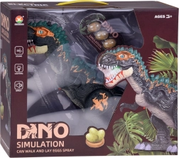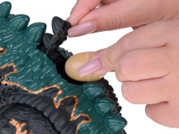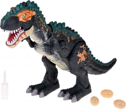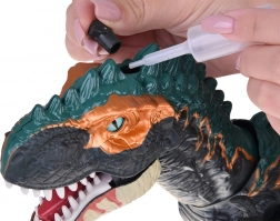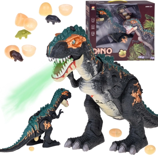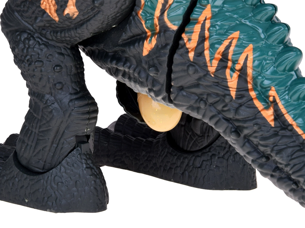 Effet vapeur unique : sous la pointe noire sur la tête se trouve un réservoir d’eau. Après remplissage avec la bouteille fournie, le dinosaure émet de la vapeur par la gueule, en plus éclairée par une LED, créant ainsi un effet visuel spectaculaire. Sur le dos se trouve une ouverture pour insérer les œufs – le T‑Rex les « pond » ensuite. Le coffret comprend 3 œufs ouvrables avec de petites figurines de bébés à collectionner.