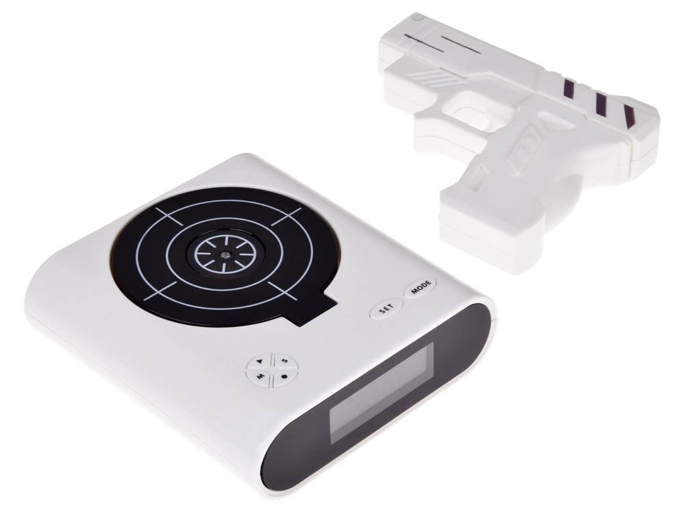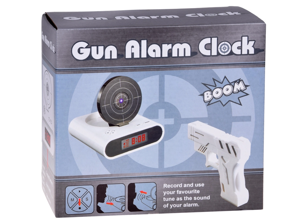 Rendez vos matinées plus agréables avec un réveil original que vous faites taire en visant la cible et en appuyant sur la gâchette. Ce réveil ludique propose un tir sur cible avec pistolet infrarouge, la possibilité d’enregistrer votre propre son d’alarme et 2 modes de jeu. Grâce à un écran LCD lisible et à une alimentation par piles ou micro USB, il est idéal pour la chambre, le bureau, ou comme cadeau insolite.