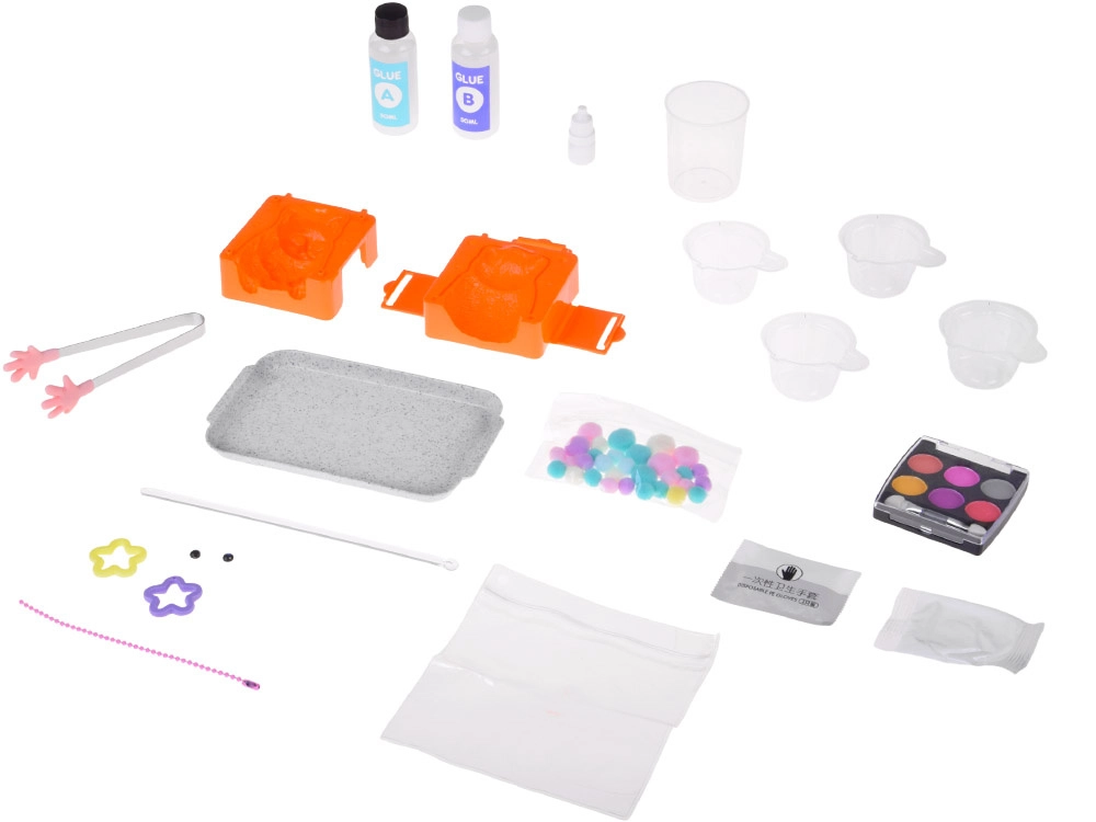 - Kit complet – moule, colles A/B, colorant, outils et décorations.