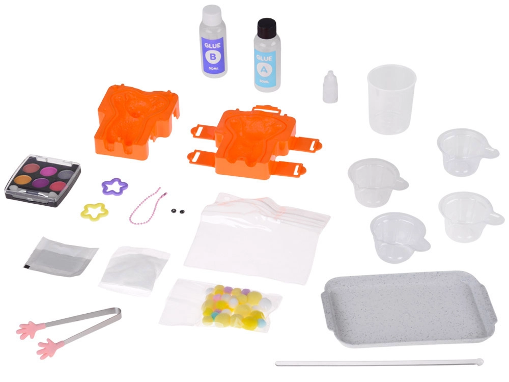 Le kit comprend un moule, une petite pince, un bâton mélangeur, des colles, un pigment, des billes duveteuses, des étoiles, des yeux, un sachet décoratif, une chaînette et plus encore – vous pouvez commencer tout de suite.
