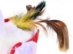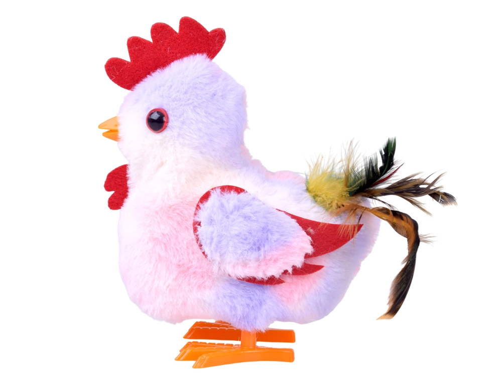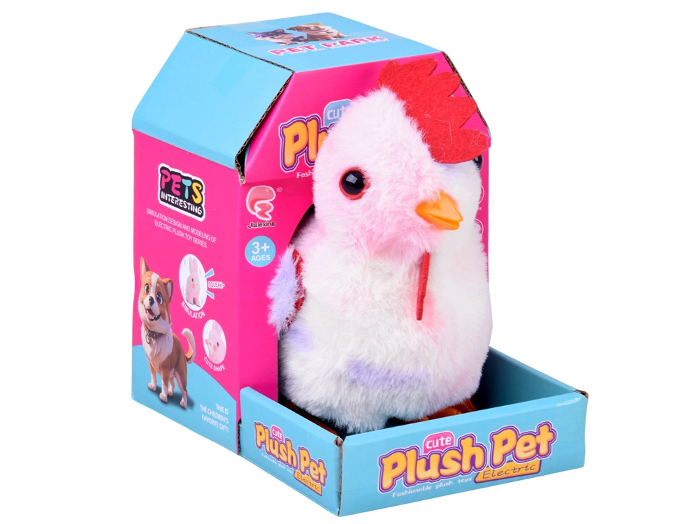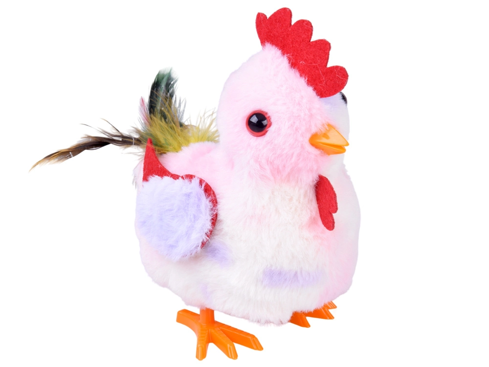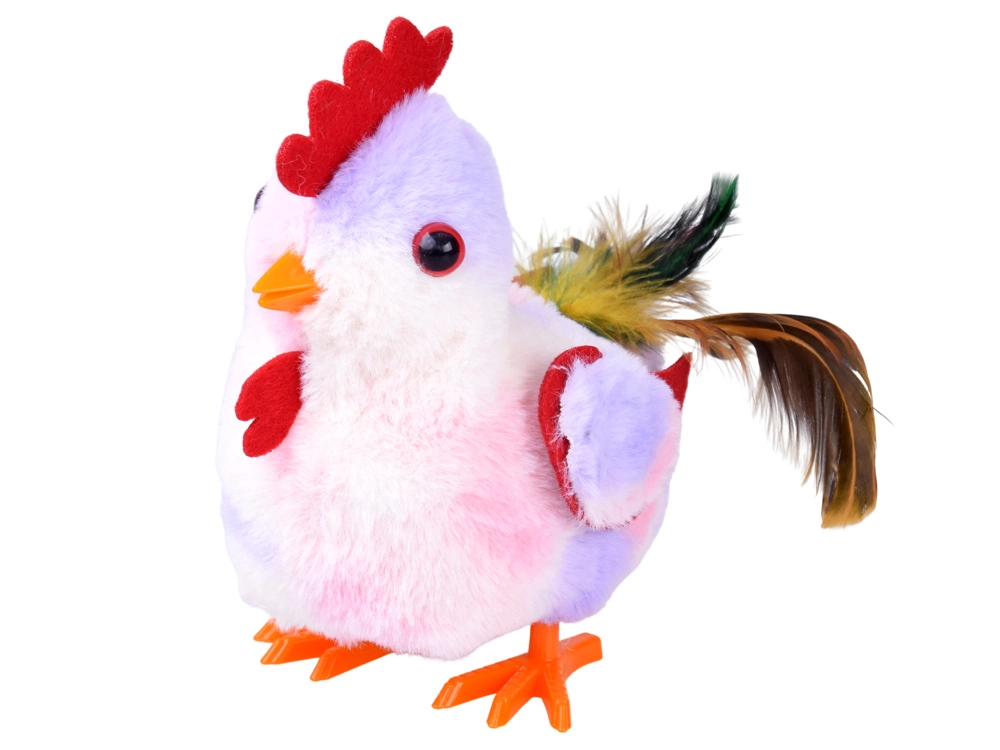 Il suffit d’insérer deux piles AA sous le ventre et de basculer l’interrupteur rouge sur « ON ». La poule commence à :