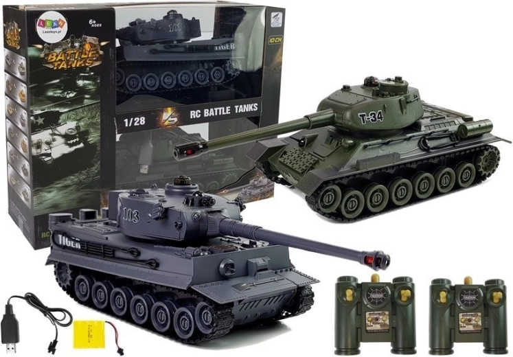 Ensemble de deux chars RC à l’échelle 1:28 pour des duels réalistes à la maison comme en extérieur. Les répliques T‑34 et TIGER 103 offrent une tourelle rotative, des batailles infrarouges avec diminution des points de vie, un pilotage simple avant/arrière et virages et une alimentation par accus 4,8 V. Un cadeau idéal pour les petits et grands passionnés de technologie militaire.