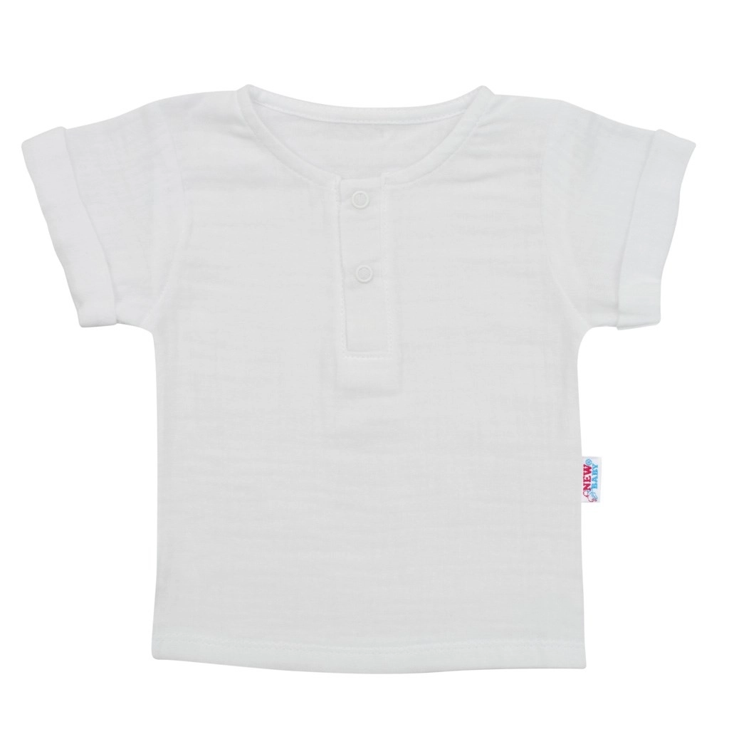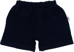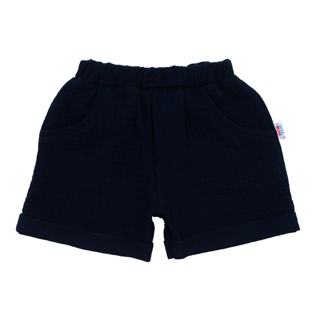 Ensemble en mousseline léger et aéré en deux pièces pour bébé de la marque New Baby en couleur bleu marine. Comprend un t-shirt à manches courtes et un short avec une ceinture élastique plus large et confortable qui n’appuie pas sur le petit ventre. La mousseline en 100 % coton est douce, respirante et idéale pour les journées d’été.