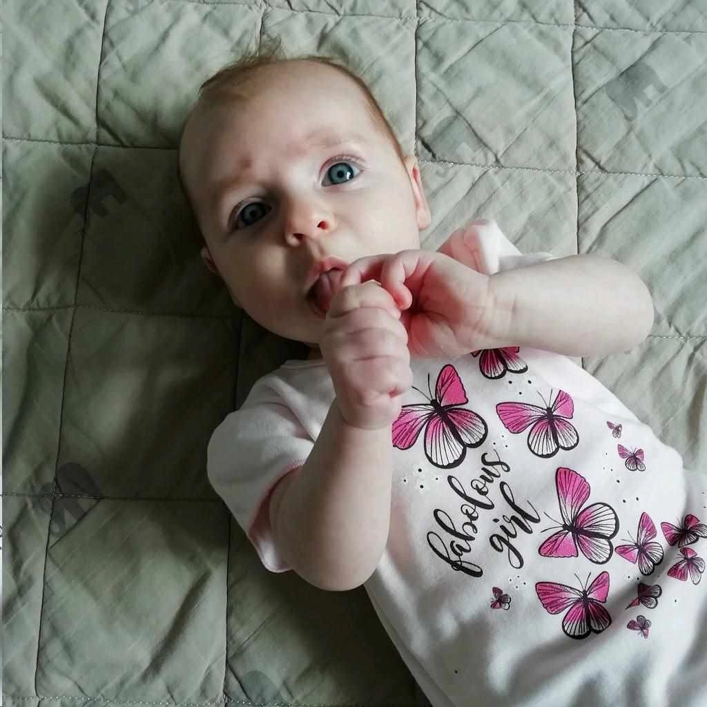 Adorable ensemble 2 pièces pour fillettes New Baby Butterflies alliant confort et style. Il comprend un t-shirt à manches courtes froncées avec imprimé papillons et une jupe gris chiné avec volant. Grâce à la fermeture à pressions sur l’épaule, le t-shirt s’enfile facilement, tandis que la jupe avec large élastique à la taille tient agréablement et ne comprime pas le petit ventre. Le t-shirt 100 % coton est doux pour la peau et la jupe extensible avec une part d’élasthanne assure une liberté de mouvement.