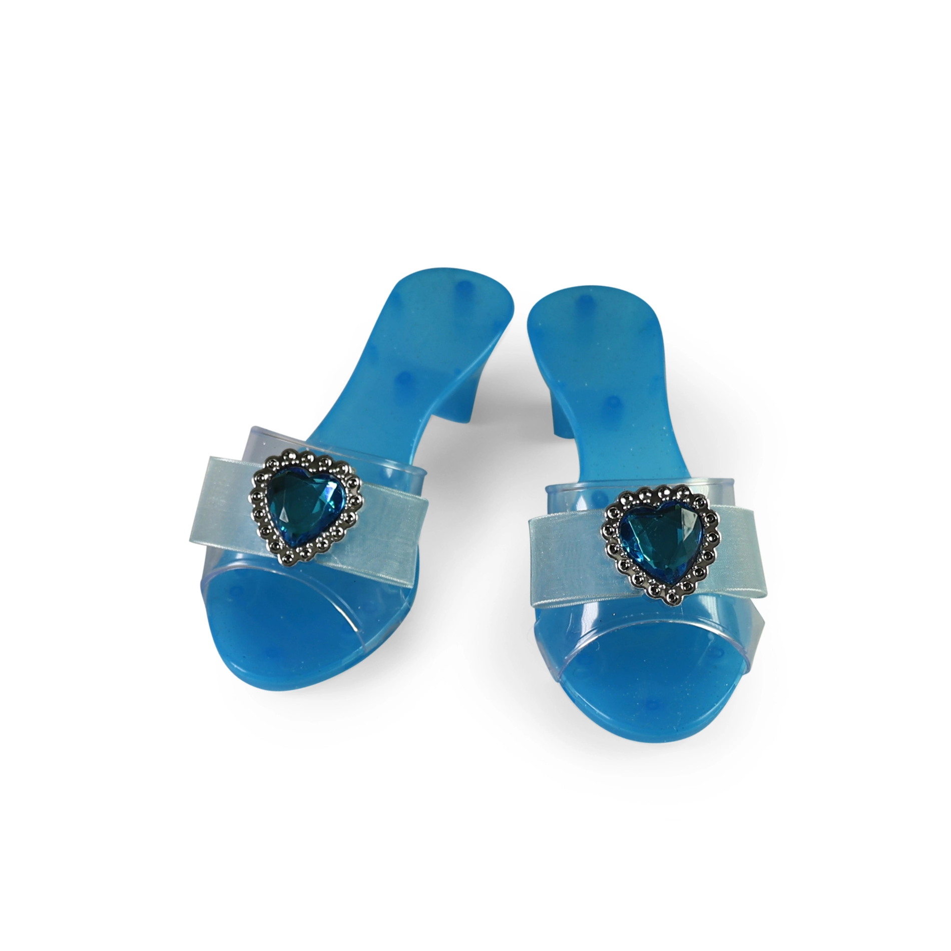 Escarpins légers en plastique avec bride transparente et pierre en forme de cœur bleue, faciles à enfiler et parfaits pour compléter tout costume.