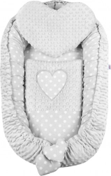 Le nid New Baby Cœur offre à votre bébé un espace douillet et protégé pendant les premiers mois de vie. Grâce à la combinaison du tissu doux minky avec reliefs 3D pour stimuler la sensomotricité et du coton 100 %, il est agréable au toucher et respectueux des peaux sensibles. La conception réversible permet de varier l’apparence et l’utilisation.