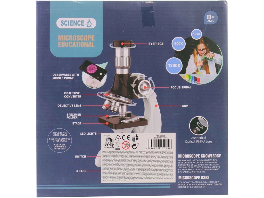 Adapté aux petits et grands explorateurs dès 8 ans – il stimule la curiosité, la concentration et le développement des compétences dans les disciplines scientifiques. Il suffit d’insérer les piles, de préparer l’échantillon et de commencer à explorer des détails fascinants invisibles à l’œil nu.