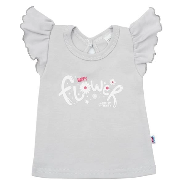 Adorable ensemble deux pièces pour bébé New Baby Happy Flower en gris, alliant confort et style au quotidien. Il comprend un t-shirt avec l’inscription Happy flower et des manches à volants, ainsi qu’un pantalon de jogging à imprimé floral intégral. Grâce au 100 % coton, il est doux pour la peau sensible des enfants et la fermeture à pression au niveau du cou facilite l’habillage.