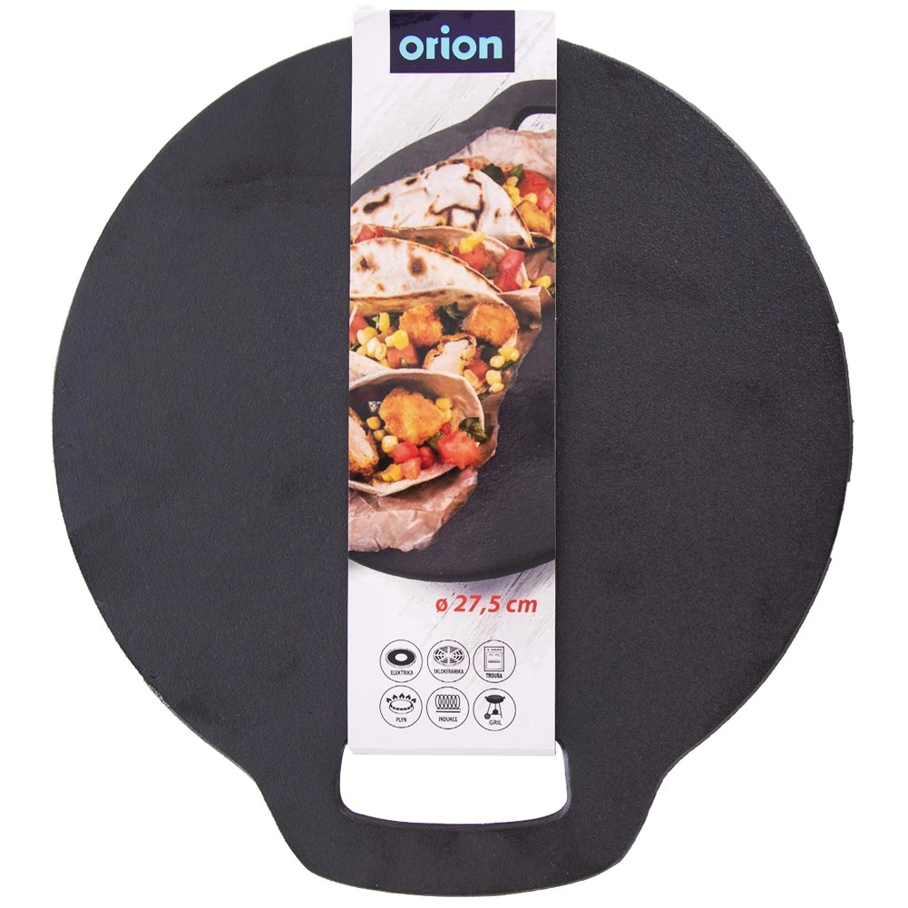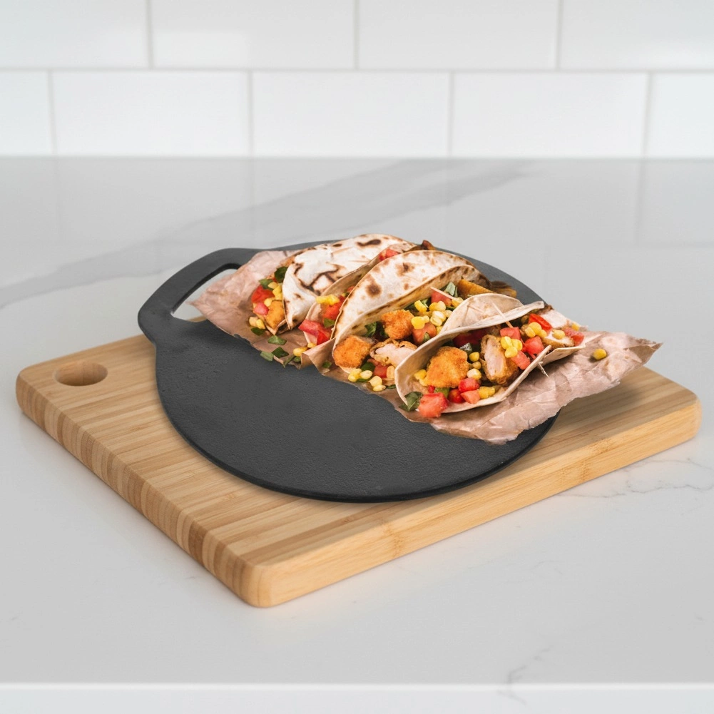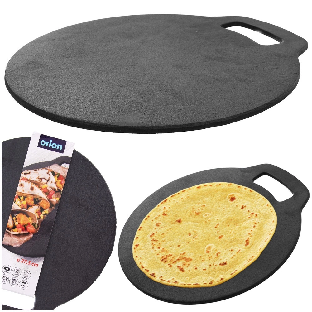 Poêle universelle en fonte de 25 cm de diamètre pour préparer tortillas, crêpes, galettes de pommes de terre et pizza. La fonte massive conduit et retient parfaitement la chaleur, résiste aux hautes températures et convient aux plaques gaz, électriques, vitrocéramiques, halogènes et à induction, au four, au gril et même au feu direct.