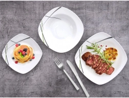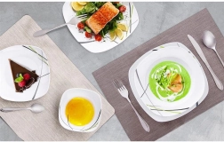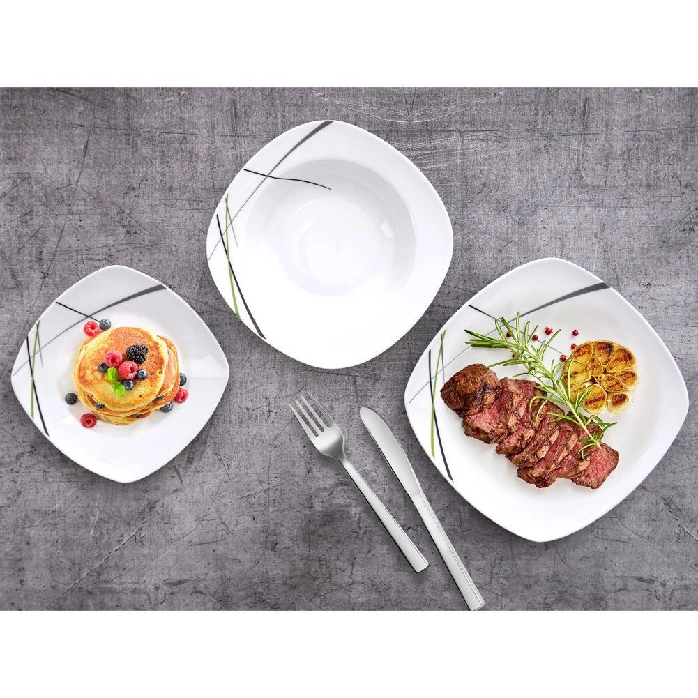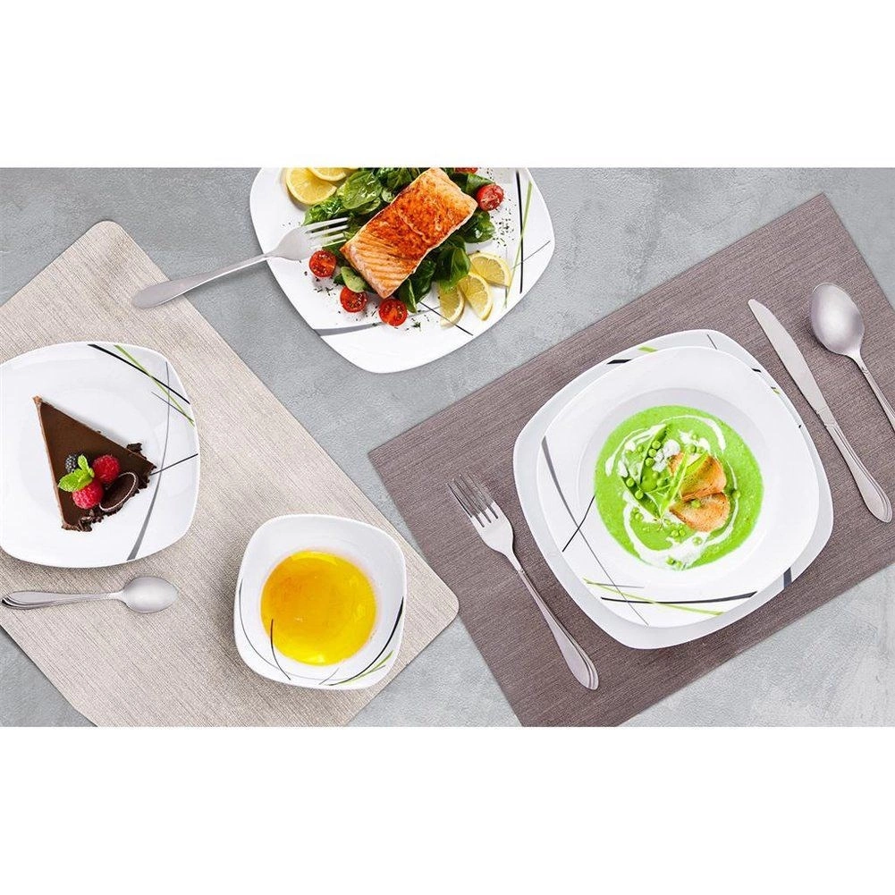 Ce service de table carré en porcelaine de qualité apporte style et praticité à chaque foyer. Le décor moderne associant le vert, le noir et le gris se distingue joliment sur la table et s’accorde aisément avec le reste de votre vaisselle. Idéal pour le petit-déjeuner, le déjeuner et le dîner, il est parfait pour les réunions familiales comme pour les repas de fête.