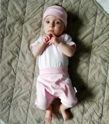 Le body possède une bordure colorée autour de l’encolure, des manches et des jambes, ainsi qu’une fermeture à pressions entre les jambes pour faciliter le change. Le short se distingue par des bords plus étroits et élastiques au bas des jambes et une coupe chic offrant une grande liberté de mouvement. Le bandeau est élastique, tient bien et est agréable à porter.