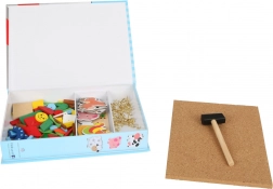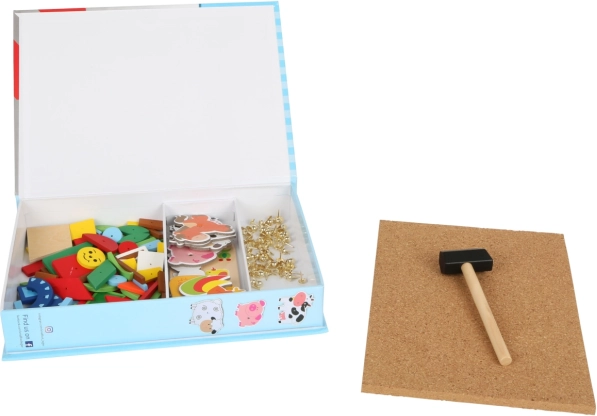 Planche en liège, marteau, pièces colorées et trous pré-percés pour un cloutage facile – le tout dans une boîte élégante, idéale pour offrir.