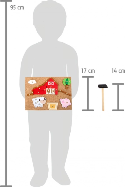 Les enfants assemblent et clouent des formes sur la planche en liège, entraînant ainsi coordination, précision et imagination en créant des scènes de ferme.