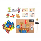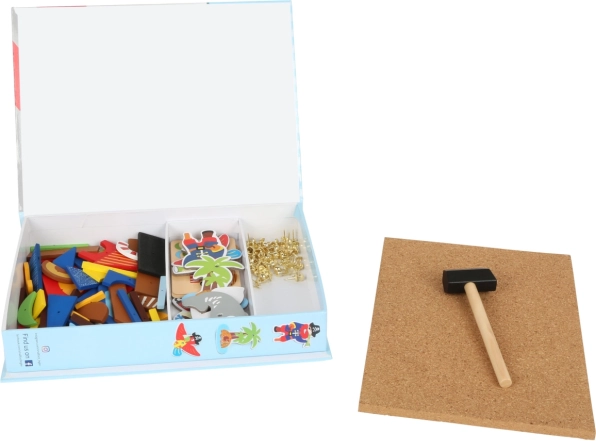 - pièces en bois à motifs pirates, punaises dorées, panneau en liège souple, petit marteau en bois, 4 cartes de modèles recto-verso, boîte de rangement