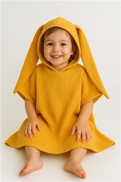 Un poncho en mousseline pour enfants NEW BABY Feeling, ultraléger et tout doux, idéal après le bain, à la piscine ou à la mer. En mousseline 100 % coton, il est respirant, sèche rapidement et très absorbant. Sa coupe ample et confortable avec de petites oreilles adorables, ses pressions latérales pratiques et sa capacité à accompagner la croissance de l’enfant en font un compagnon pour toute l’année.
