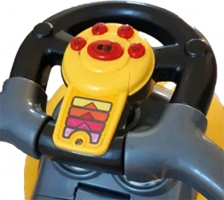Pour plus de confort, le véhicule est équipé de repose‑pieds inférieurs et de protections latérales de sécurité, facilement démontables. Le volant avec panneau musical et klaxon augmente le plaisir et favorise le développement de la motricité. Sous le siège, vous trouverez un espace de rangement pratique pour les petites affaires et les jouets.
