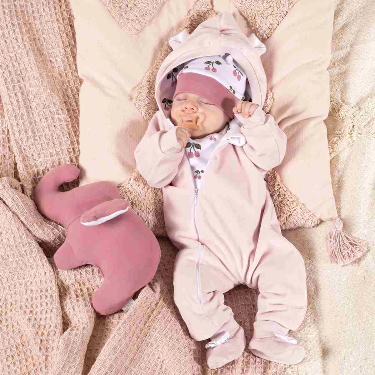 Des détails pratiques, comme les manches repliables et la capuche avec de jolies petites oreilles, en font un choix idéal pour les promenades quotidiennes et les trajets en poussette. Le matériau conserve durablement sa forme et son aspect, si bien que la combinaison reste superbe même après des lavages répétés.