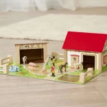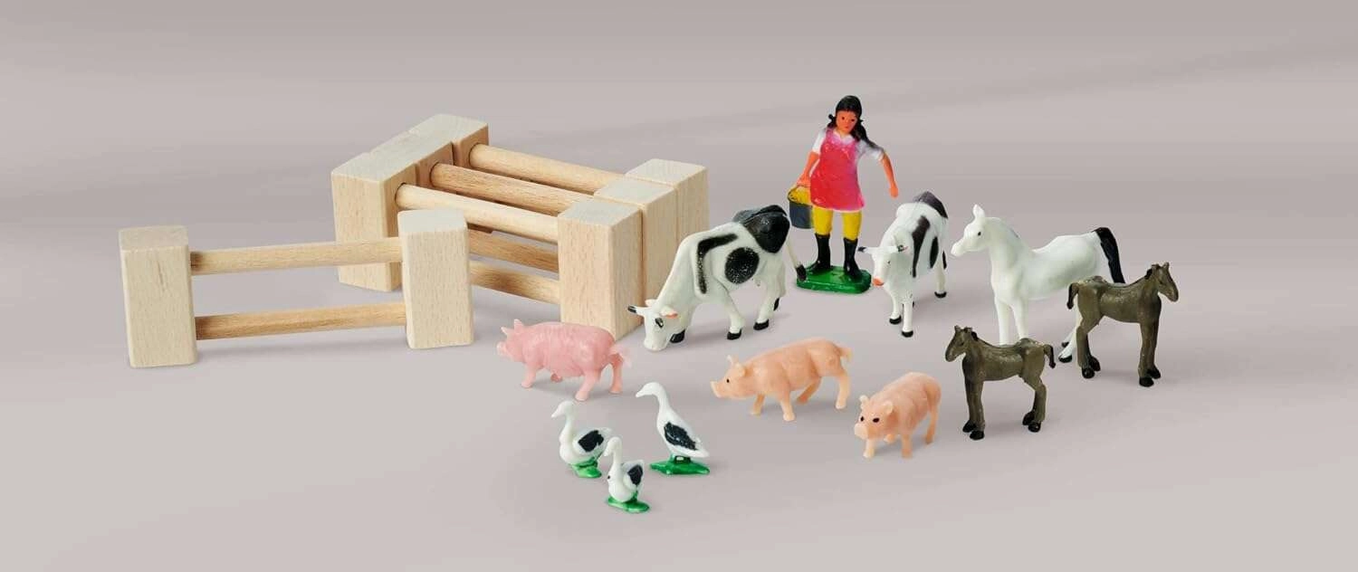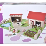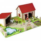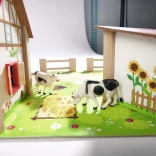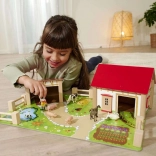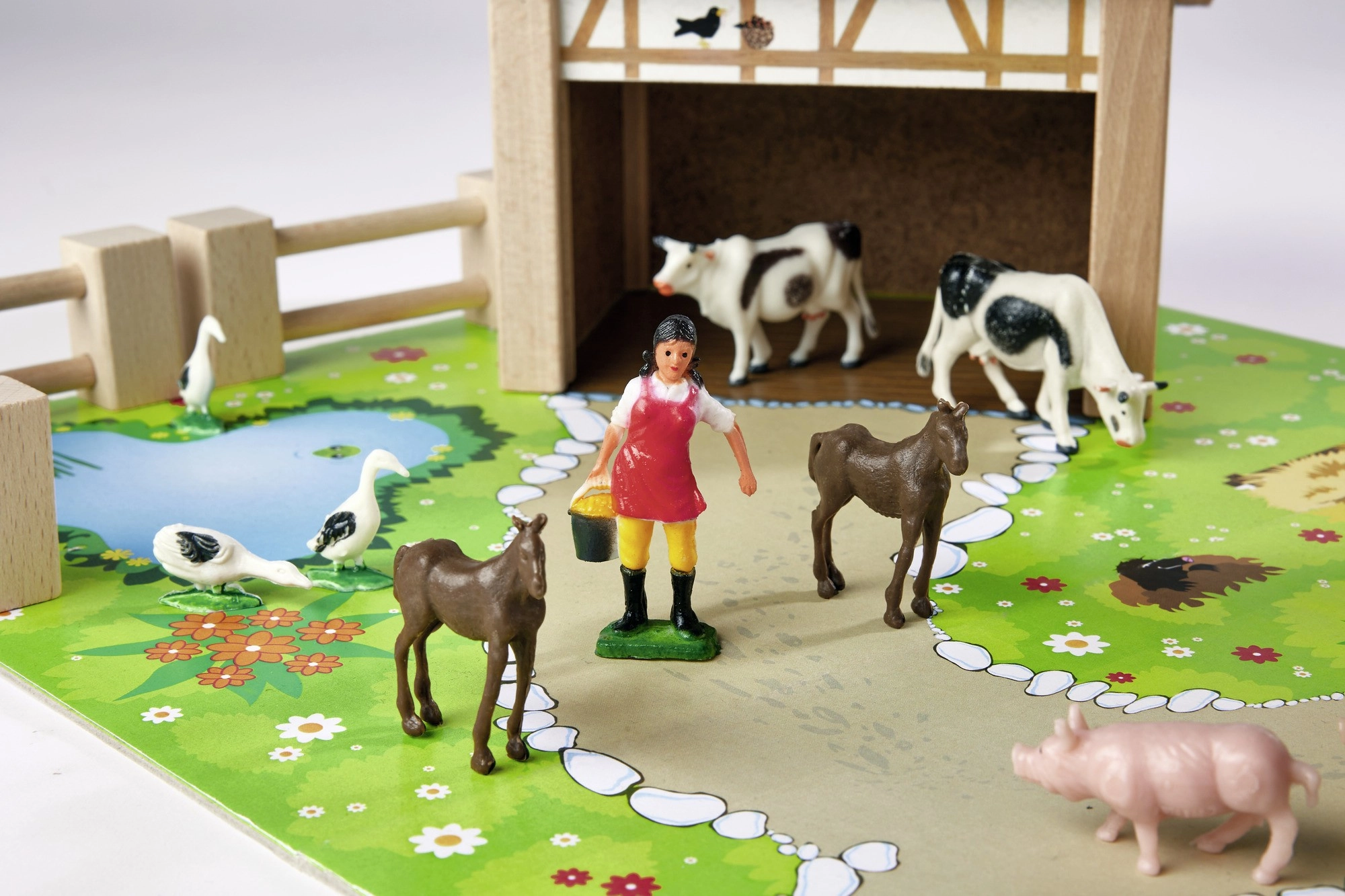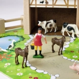 - Maison avec grange et étable, base colorée, clôtures, autocollants, 12 figurines (animaux et personnage du fermier)