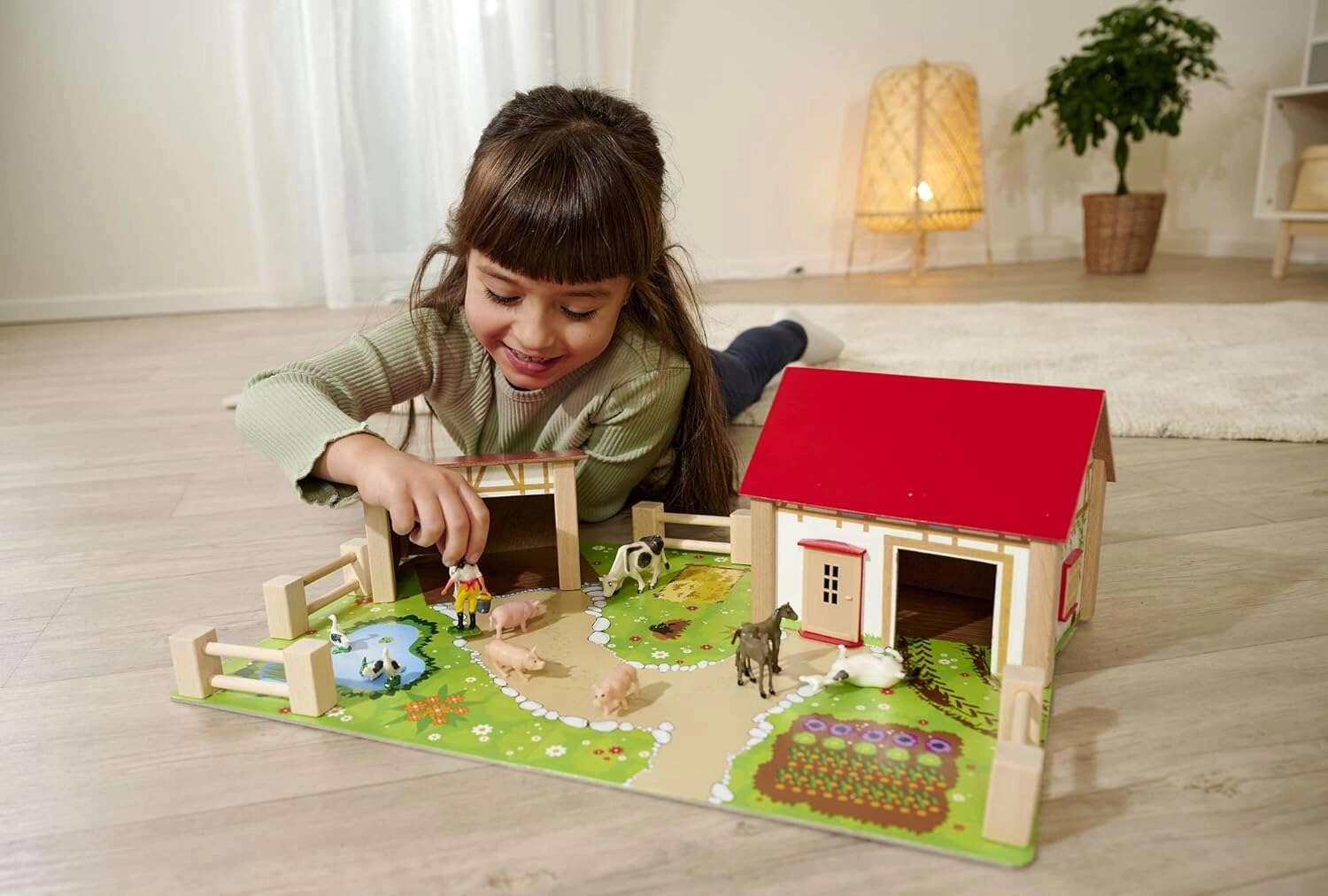 Découvrez la magie de la campagne avec la ferme en bois EICHHORN, qui propose 25 pièces pour un jeu créatif. Des bâtiments en bois robustes, des clôtures mobiles et de jolies figurines d’animaux invitent les enfants à développer leur imagination, leur motricité fine et leur pensée logique. Le tapis coloré avec sentiers, étang et potager crée une scène de ferme réaliste.