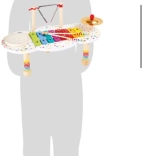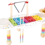 La table comprend quatre éléments sonores appréciés – un xylophone à lames colorées, un tambour, un triangle et une cymbale. Le jeu stimule la coordination œil–main, la concentration et l’acuité auditive. C’est une introduction ludique au monde de la musique qui nourrit l’imagination et le jeu autonome.