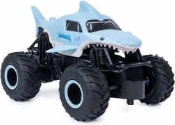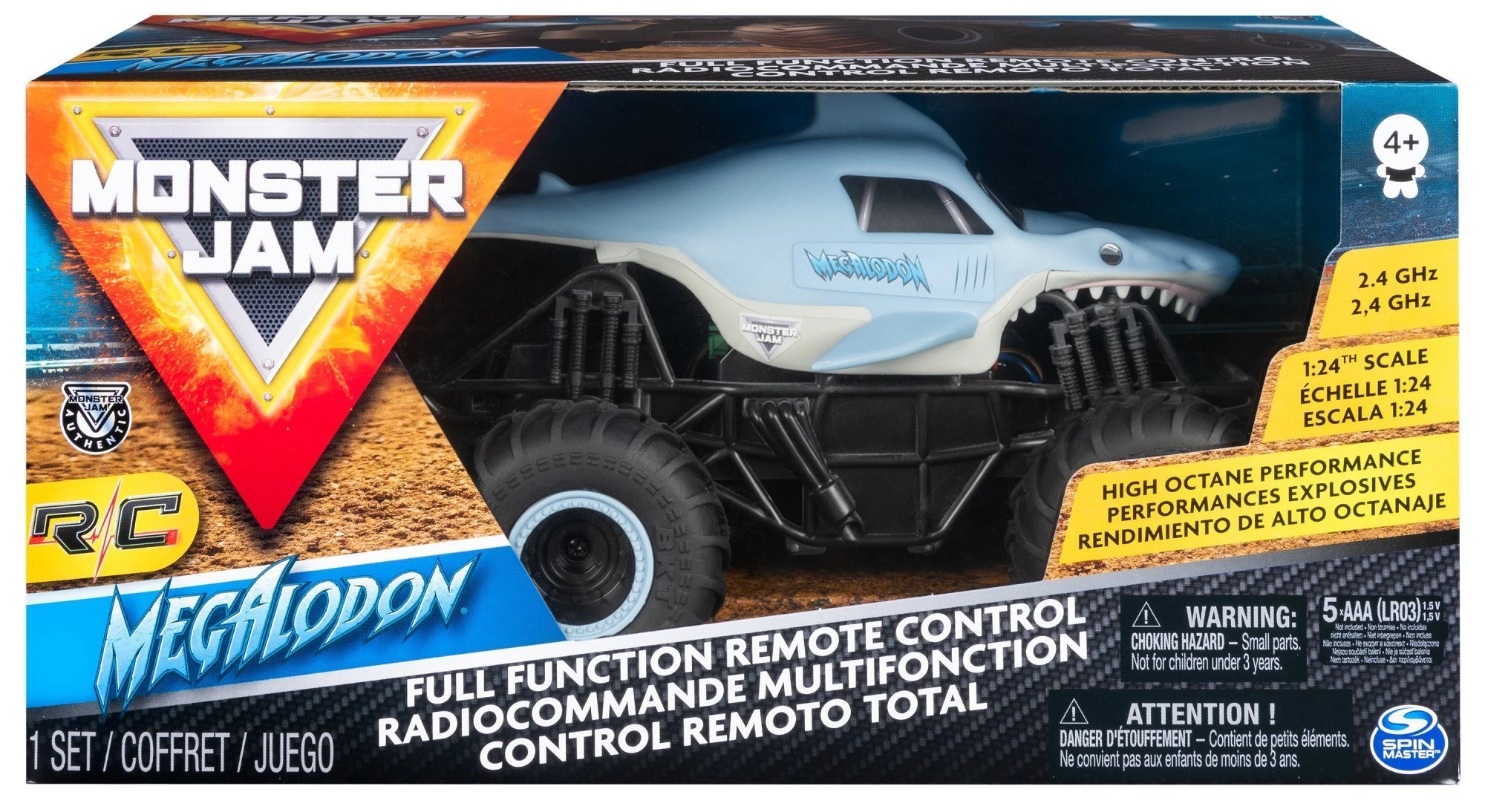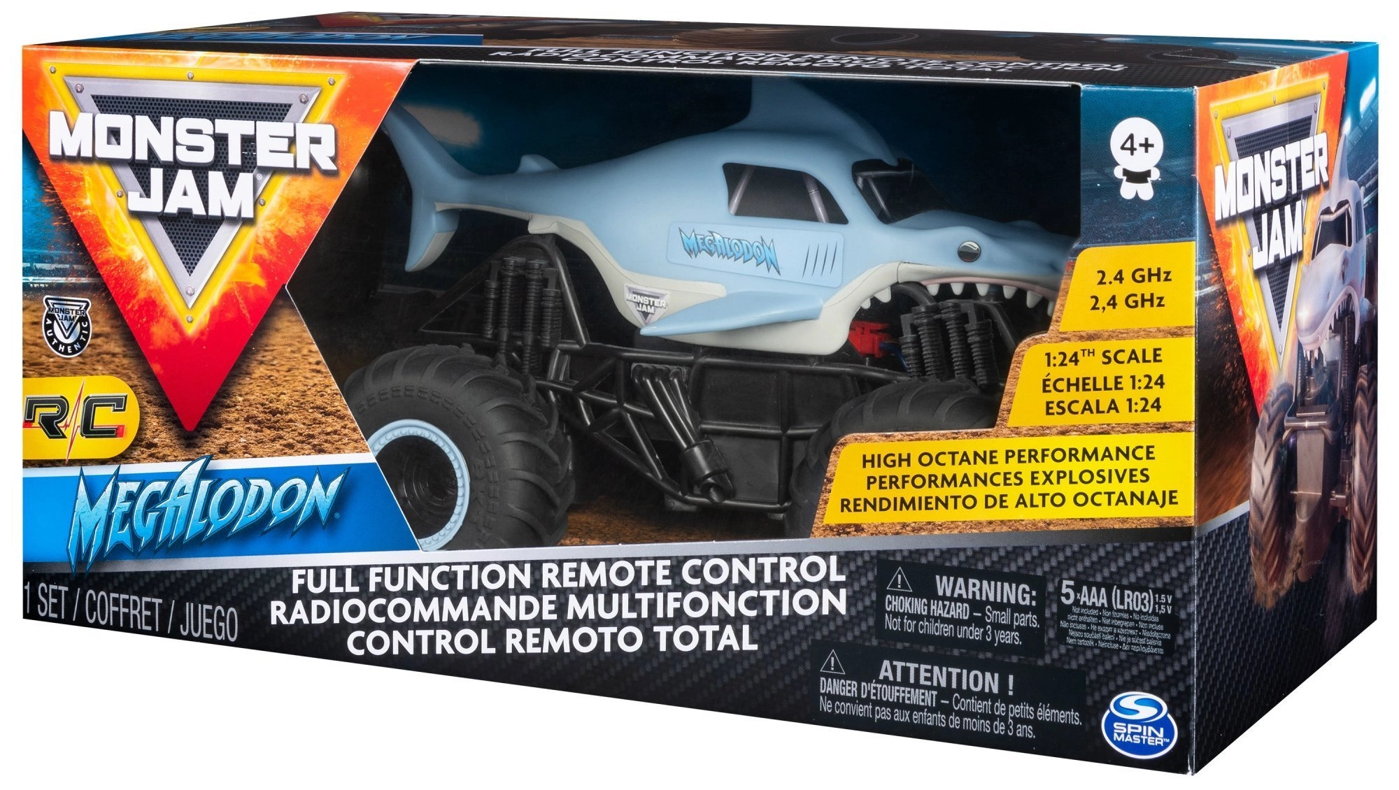 La voiture RC sous licence MONSTER JAM Megalodon offre le look authentique du monster truck iconique avec une carrosserie bleue inspirée du requin, des nageoires et des dents. L’échelle 1:24 est idéale pour les courses à la maison et les premières expériences RC.