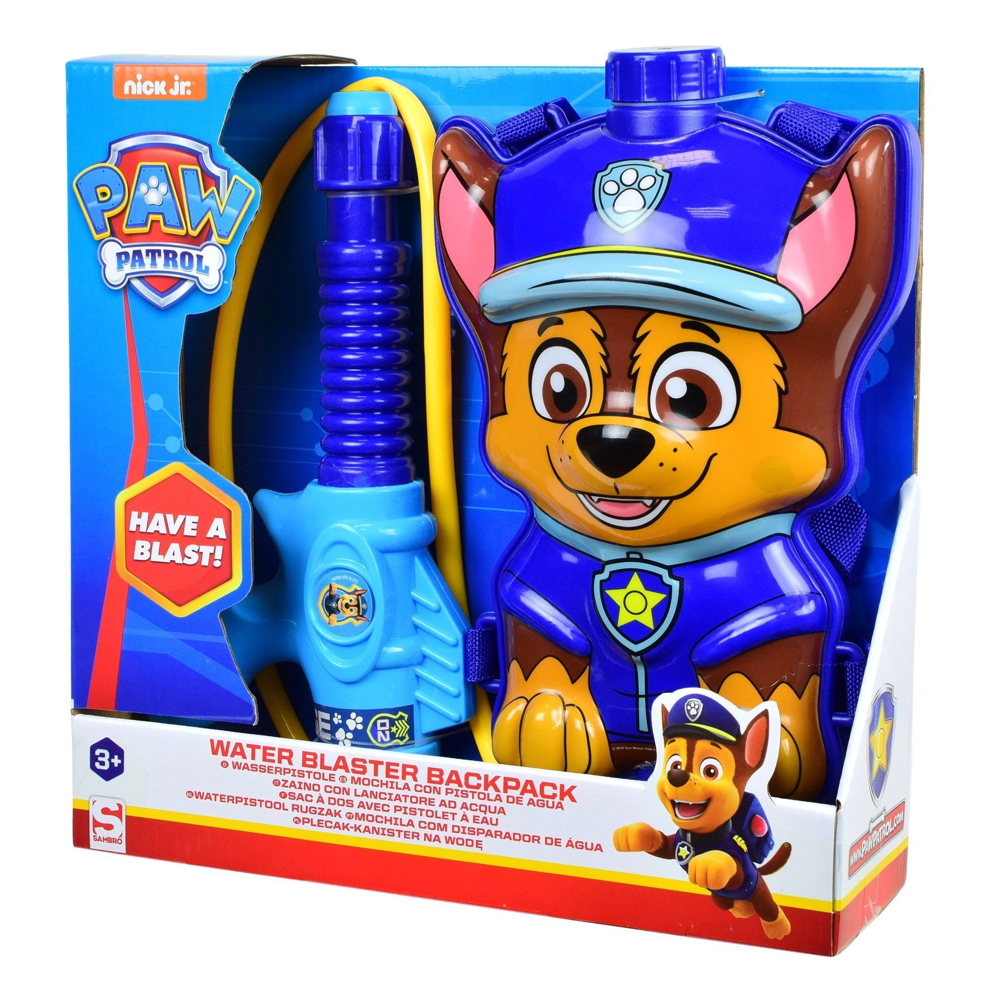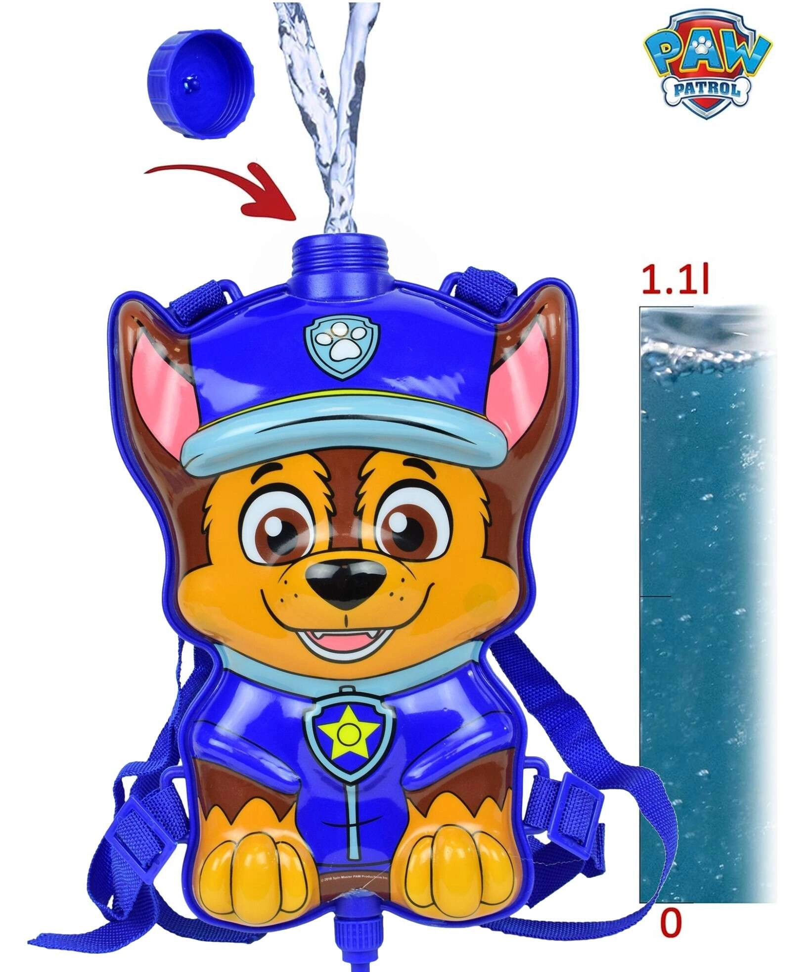 Sac à eau ludique avec le personnage Chase de la série Pat’ Patrouille pour un divertissement estival sans fin. Le sac à dos possède des bretelles réglables, une ouverture de remplissage avec bouchon et est relié par un tuyau à une pistolet à eau manuel avec pompe. Idéal pour le jardin, la plage ou l’aire de jeux.