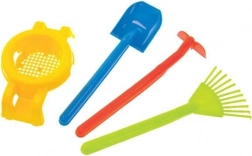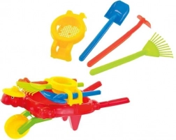 La grande roue mobile assure une conduite fluide et stable sur différentes surfaces, tandis que les deux béquilles permettent de poser la brouette en toute sécurité. Les poignées ergonomiques sont adaptées aux paumes des enfants et favorisent une prise en main sûre. Le paquet inclut des accessoires pratiques : râteau, pelle, houe et tamis – idéals pour transporter de la terre, ramasser des feuilles ou tamiser le sable.