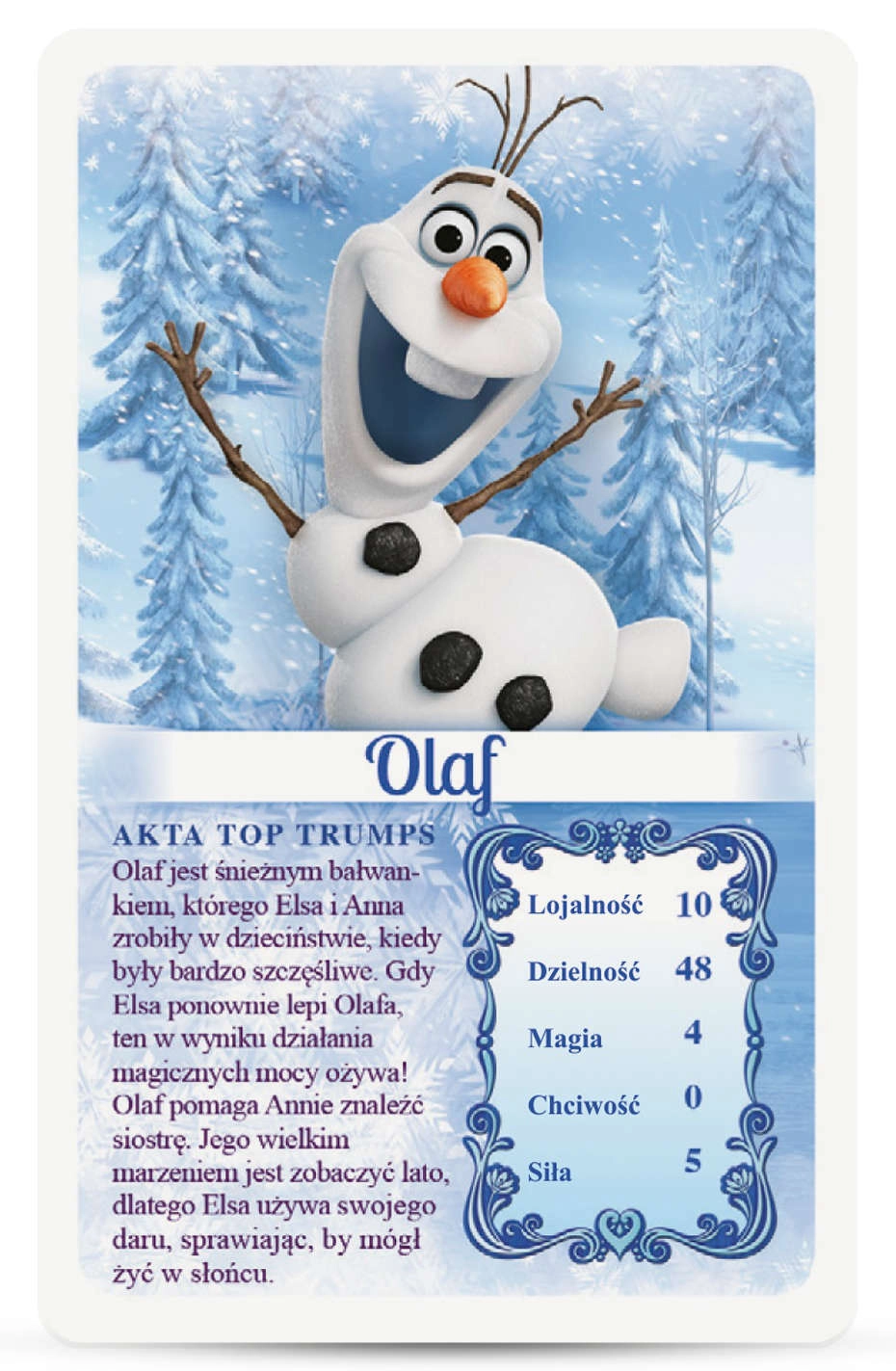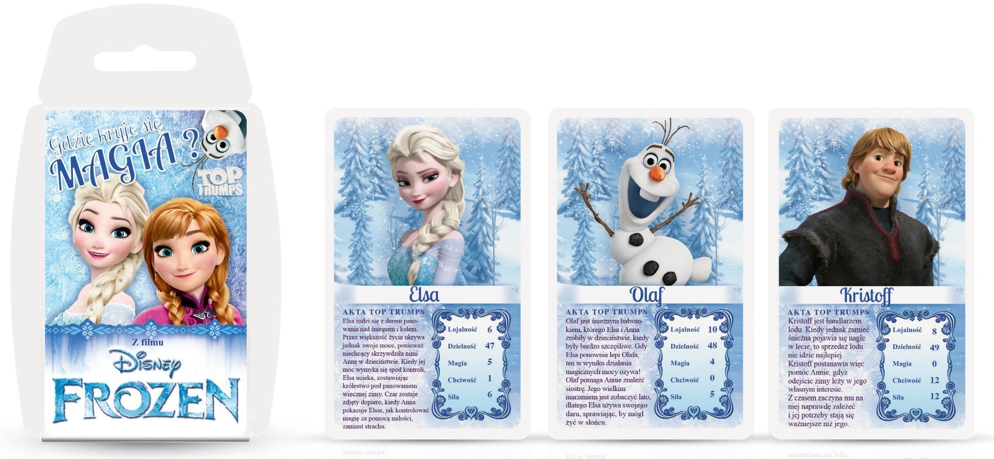 Top Trumps est un jeu de cartes populaire qui divertit les familles depuis des décennies. Dans l’édition La Reine des Neiges, retrouvez les héros du célèbre film DISNEY et comparez leurs caractéristiques, comme la magie, le courage ou la sagesse. Le but est de choisir la meilleure valeur et de gagner les cartes des adversaires – remporte la partie celui qui rassemble tout le paquet.