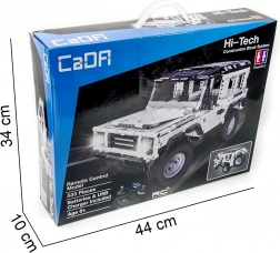 Découvrez le kit de construction CaDA de la gamme Hi‑Tech, avec lequel vous assemblerez une voiture tout‑terrain blanche télécommandée composée de 533 pièces. Le modèle dispose de portes ouvrantes, de détails réalistes et, grâce à la télécommande 2,4 GHz, se pilote facilement jusqu’à 25 mètres. Sont inclus une batterie 3,6 V 400 mAh et un chargeur USB – insérez simplement des piles dans la télécommande et le plaisir peut commencer.