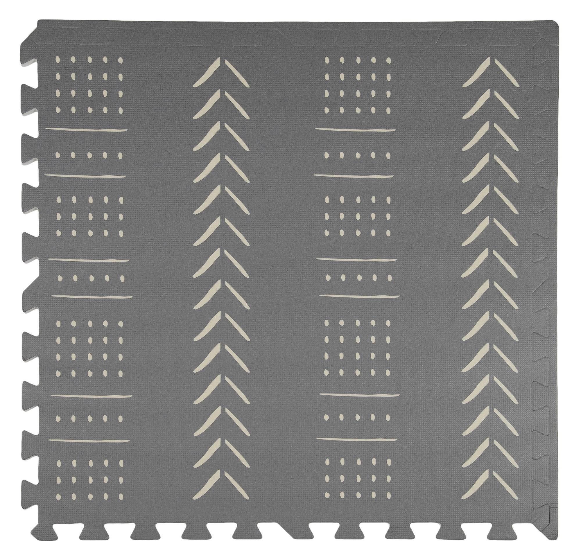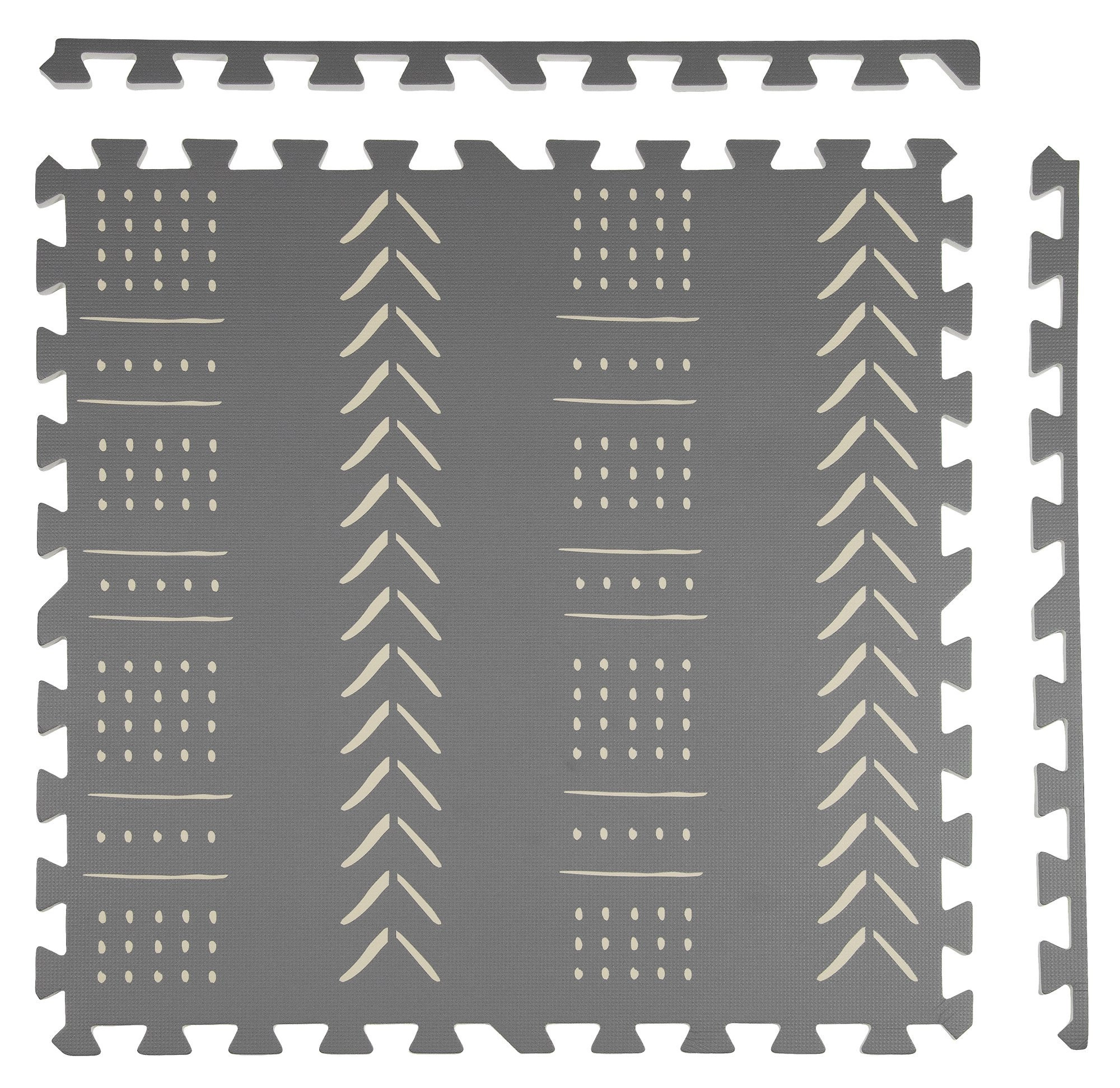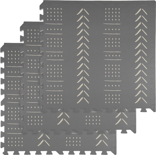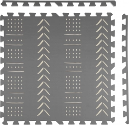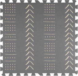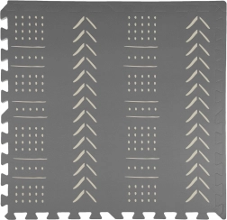 Le tapis en mousse pour enfants HUMBI, stylé et pratique, se compose de 3 grandes pièces de 60 × 60 cm et de 6 bordures. Il offre une surface douce pour jouer, une excellente isolation du froid, est imperméable, antidérapant et facile à nettoyer. Il ne contient pas de substances nocives et répond aux normes EN 71 et REACH. Les motifs boho gris discrets s’intègrent parfaitement à tout intérieur.