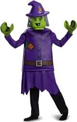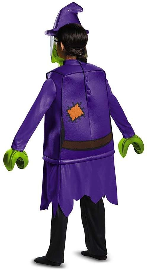 Design inspiré des figurines LEGO avec tunique violette, imprimé ceinture et pièces raccommodées, et tête de sorcière verte pour un effet inimitable.
