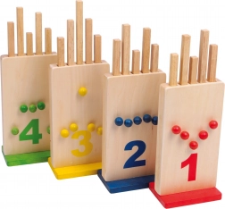 Le jeu en bois The Ruddy Holes est un jeu d’adresse captivant pour toute la famille. Chaque joueur choisit une couleur et reçoit la console correspondante. L’objectif est de répartir correctement les petites tiges à tête sphérique colorée et de les fixer solidement dans les trous de la couleur correspondante à l’aide de chevilles en bois. Gagne celui qui assemble correctement sa série colorée en premier.