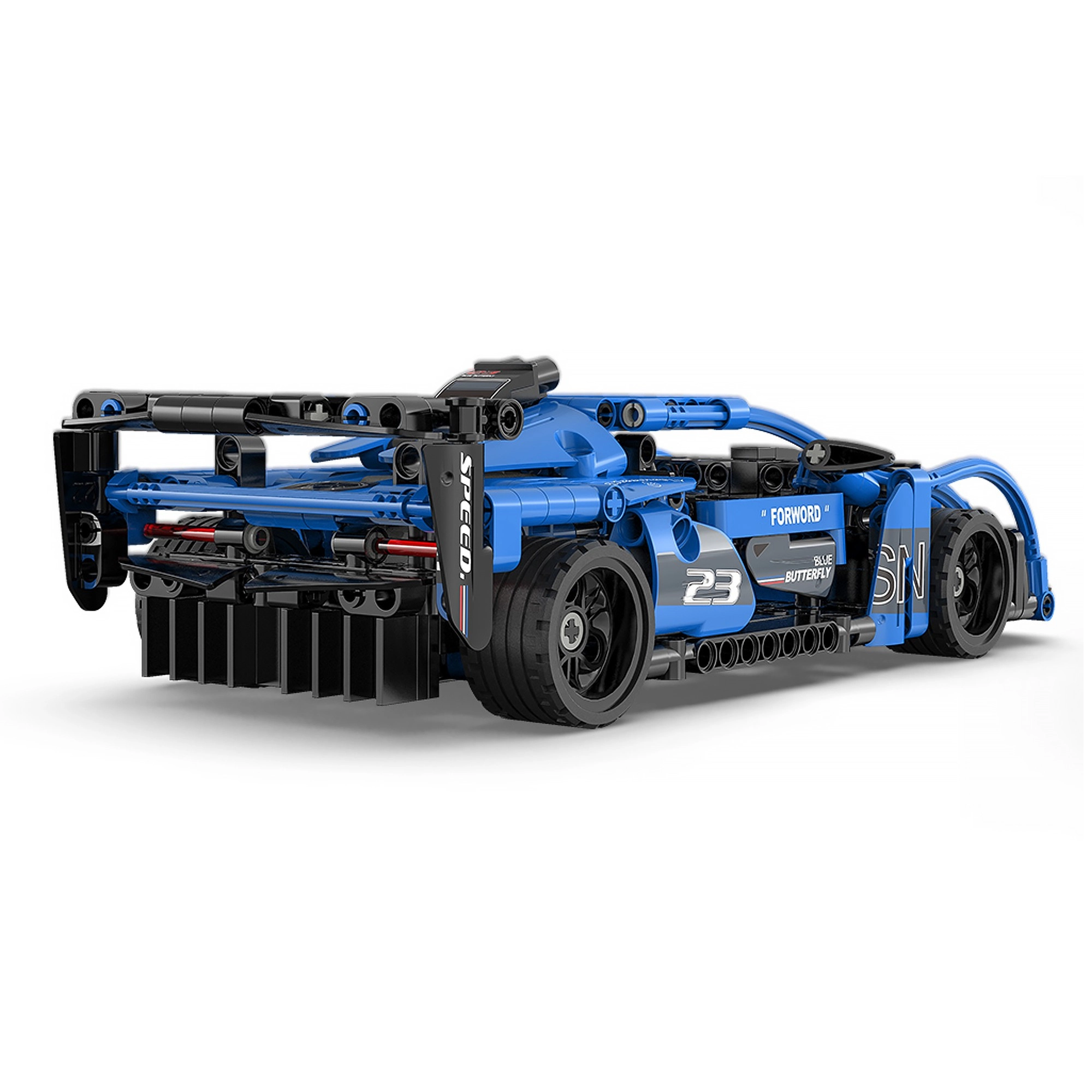 La voiture de sport Shadow est conçue avec un souci du détail qui renforce le plaisir de jeu et de construction. Grâce au mécanisme à remontée (pull‑back), il suffit de tirer la voiture vers l’arrière puis de la lâcher – elle file vers l’avant et peut parcourir plus de 10 mètres. Les roues en caoutchouc assurent une bonne adhérence et une conduite fluide.